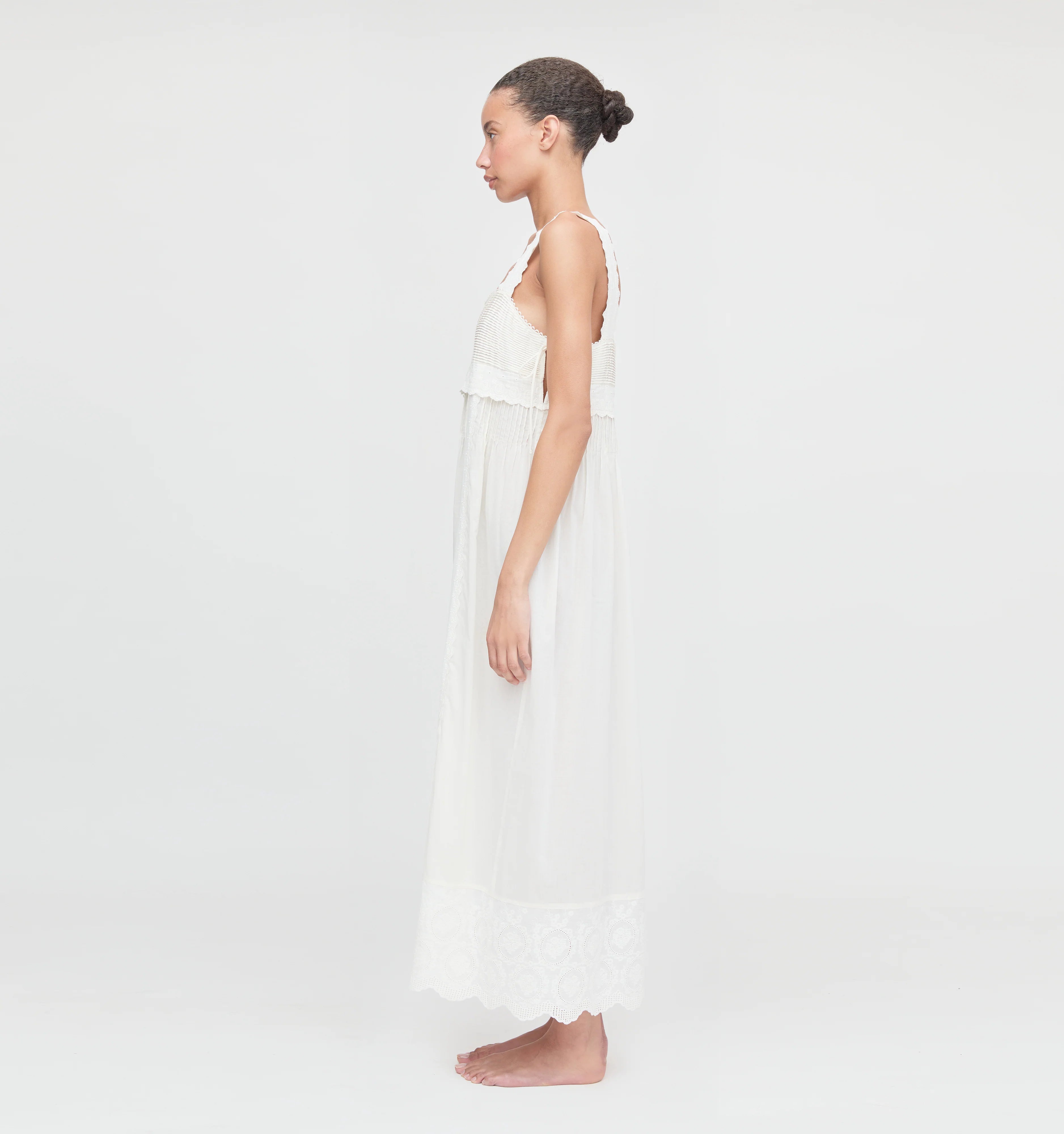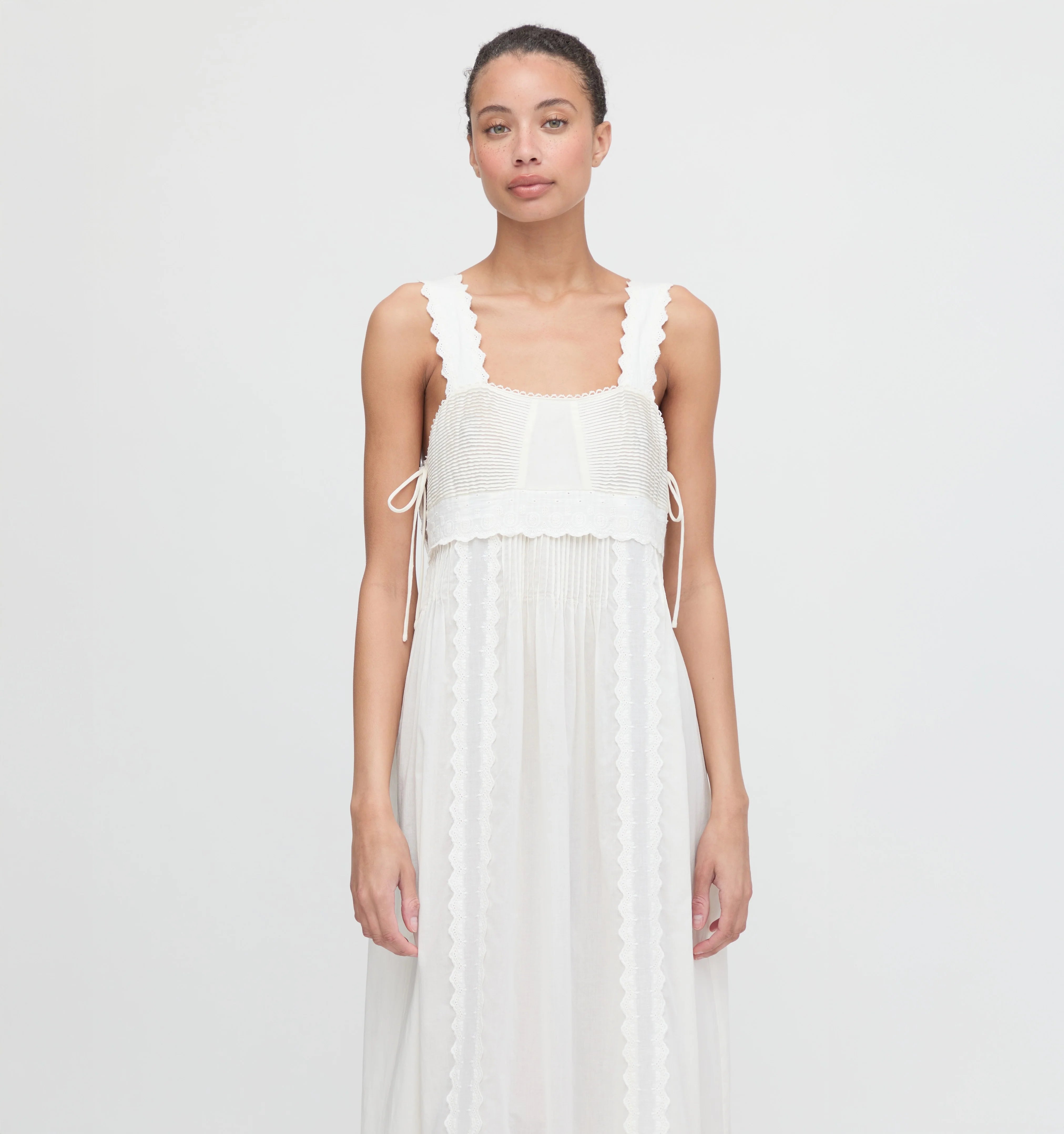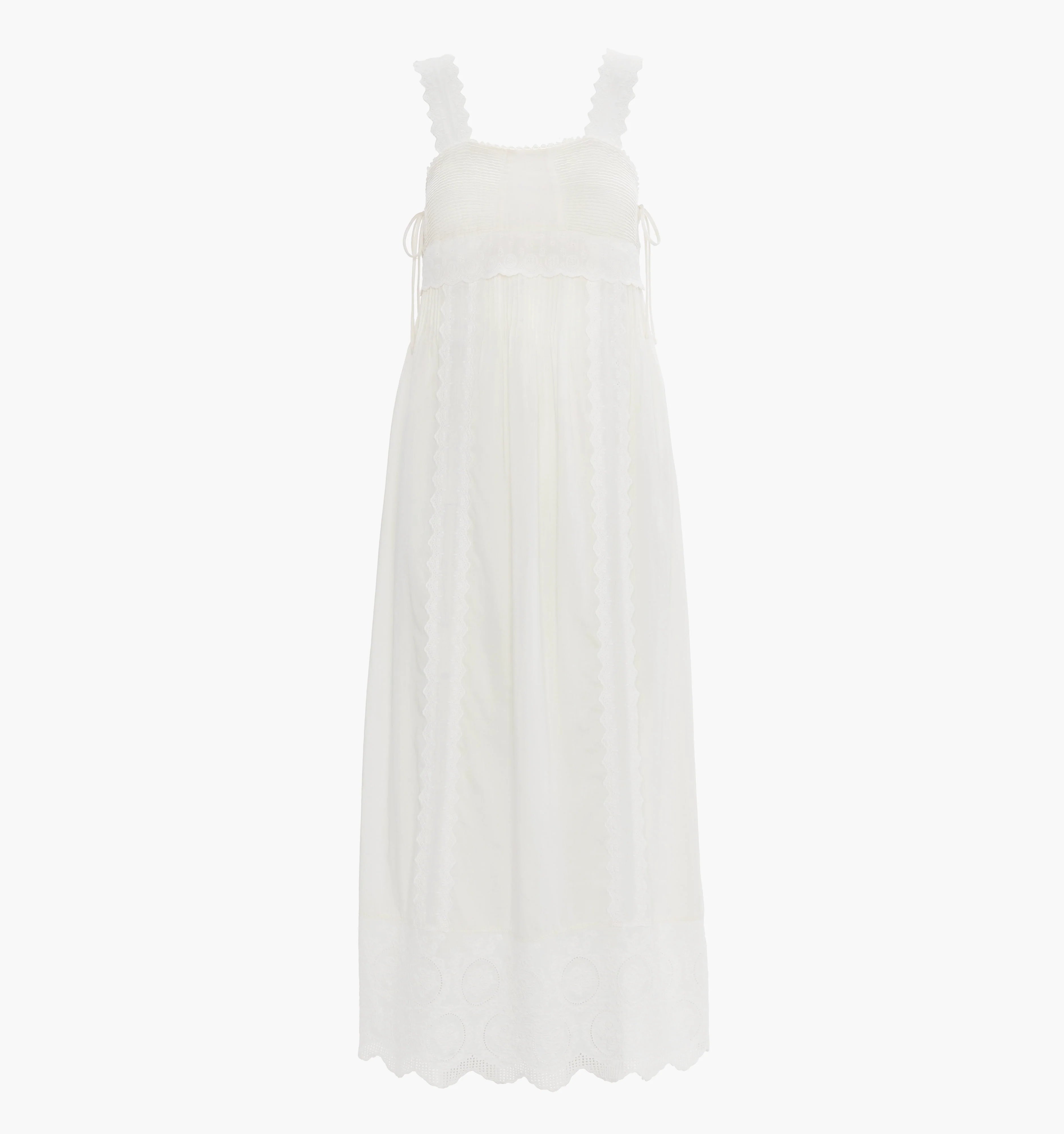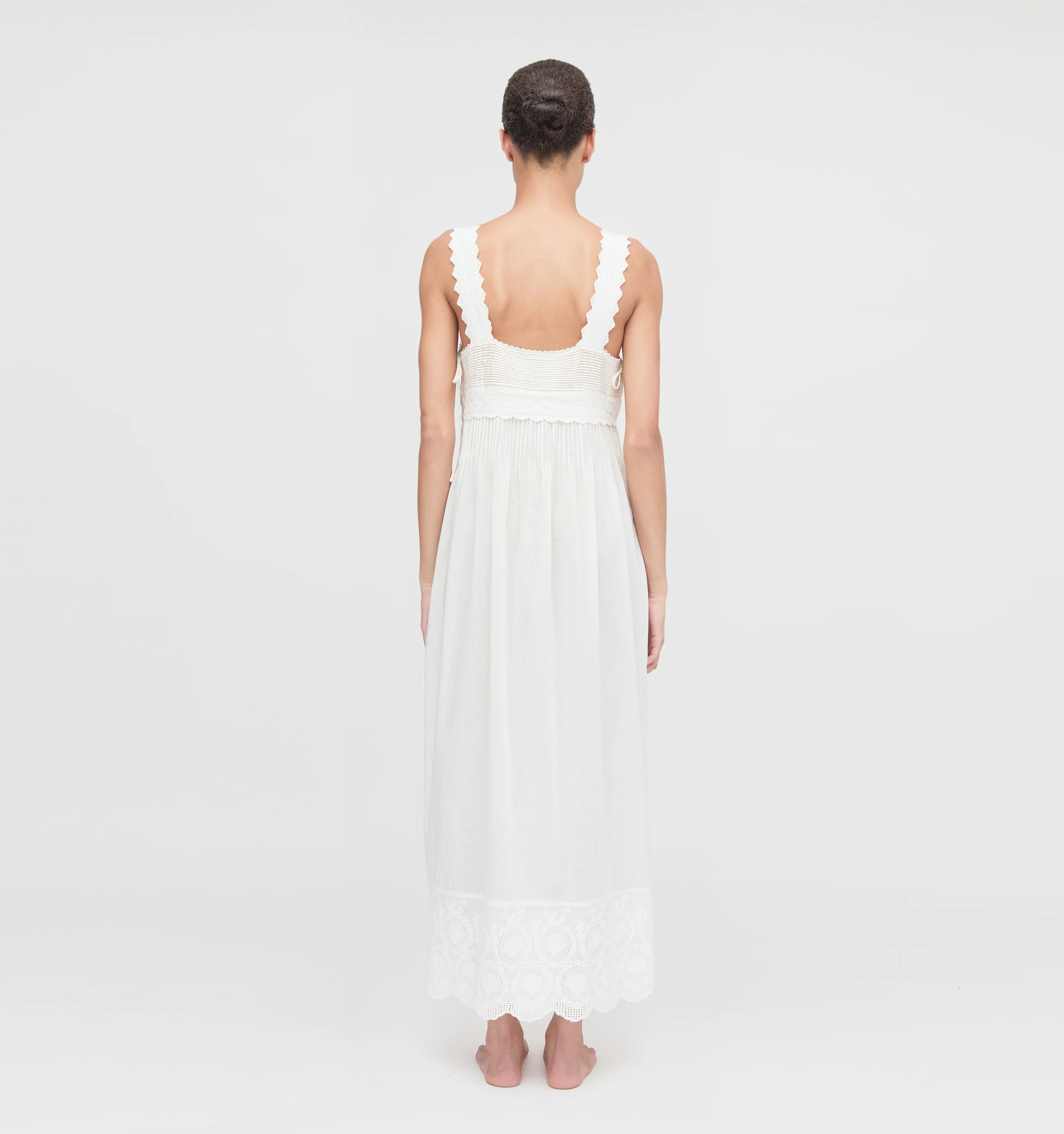 Meet the Lux Nightgown. Made from airy, ultra lightweight cotton, Lux is full of intricate, vintage-inspired details. The square neckline is trimmed with a subtle scalloped lace and includes functional, tiny bows along the sides. Lux features scalloped straps and front lace panels of delicate embroidery complete with a scalloped lace trim hem.