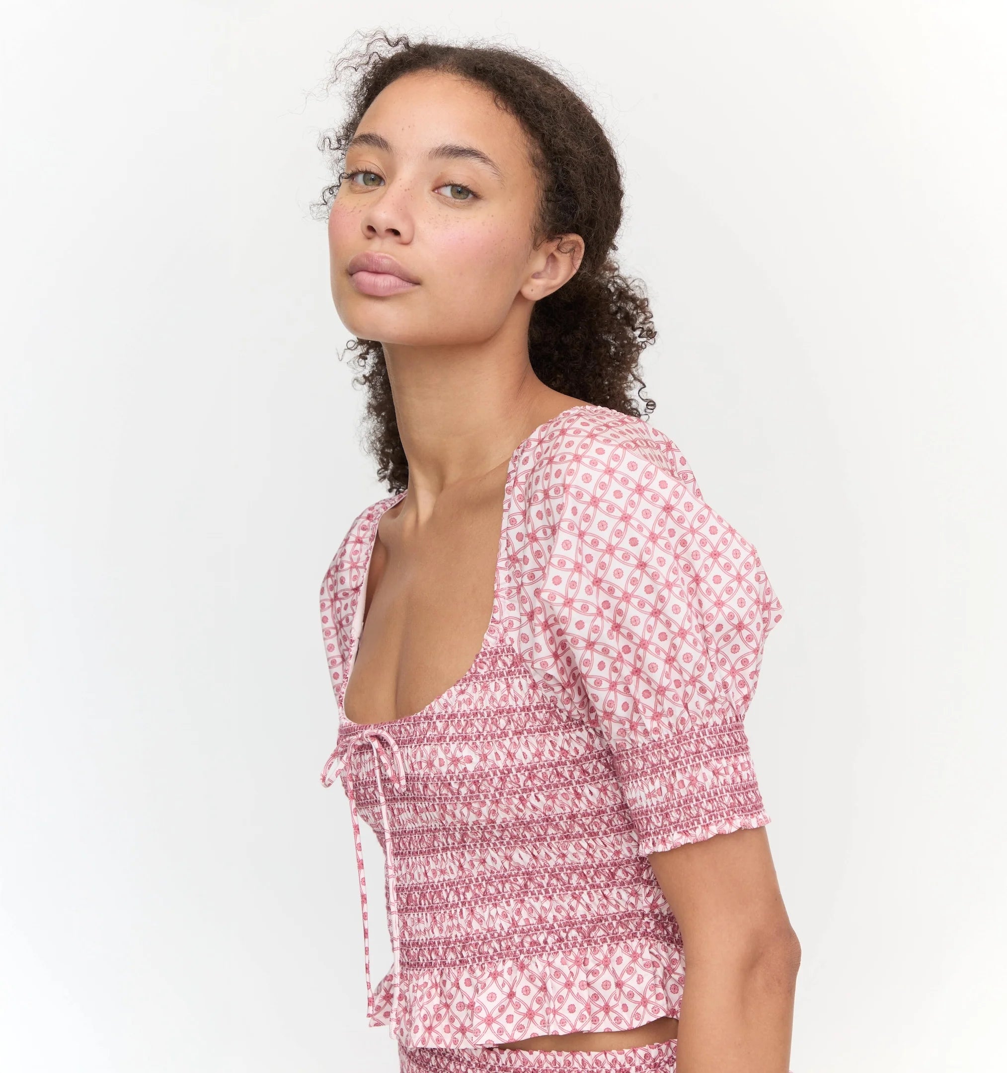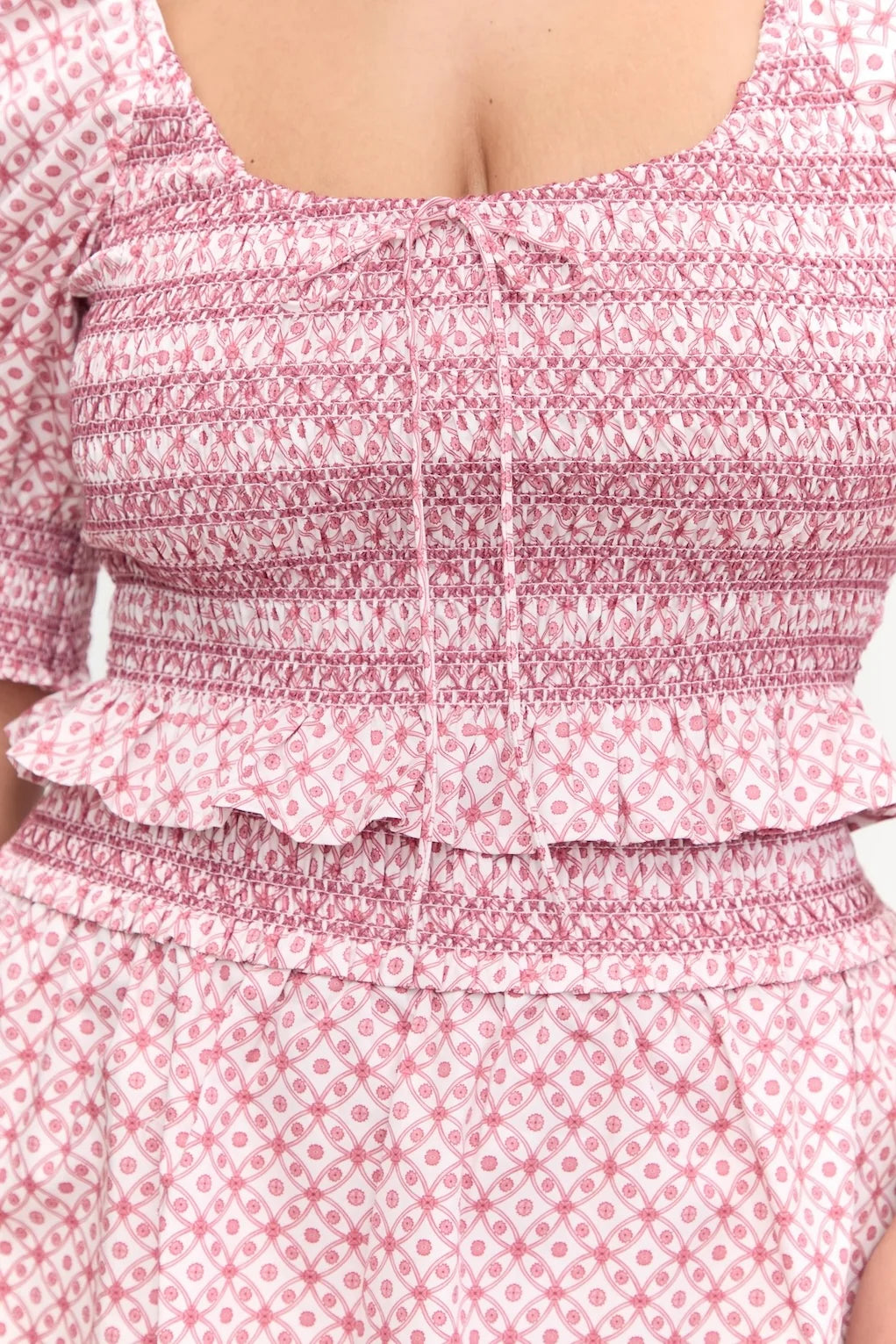 Meet the Madeline Nap Top. With a bra-friendly scoop neckline and elasticated smocking throughout the bodice, the Madeline Nap Top is as flattering as she is comfortable. Delicate, decorative smocking and a functional bow add an extra feminine touch. Pair it with the the Delphine Mini Skirt to complete the set.