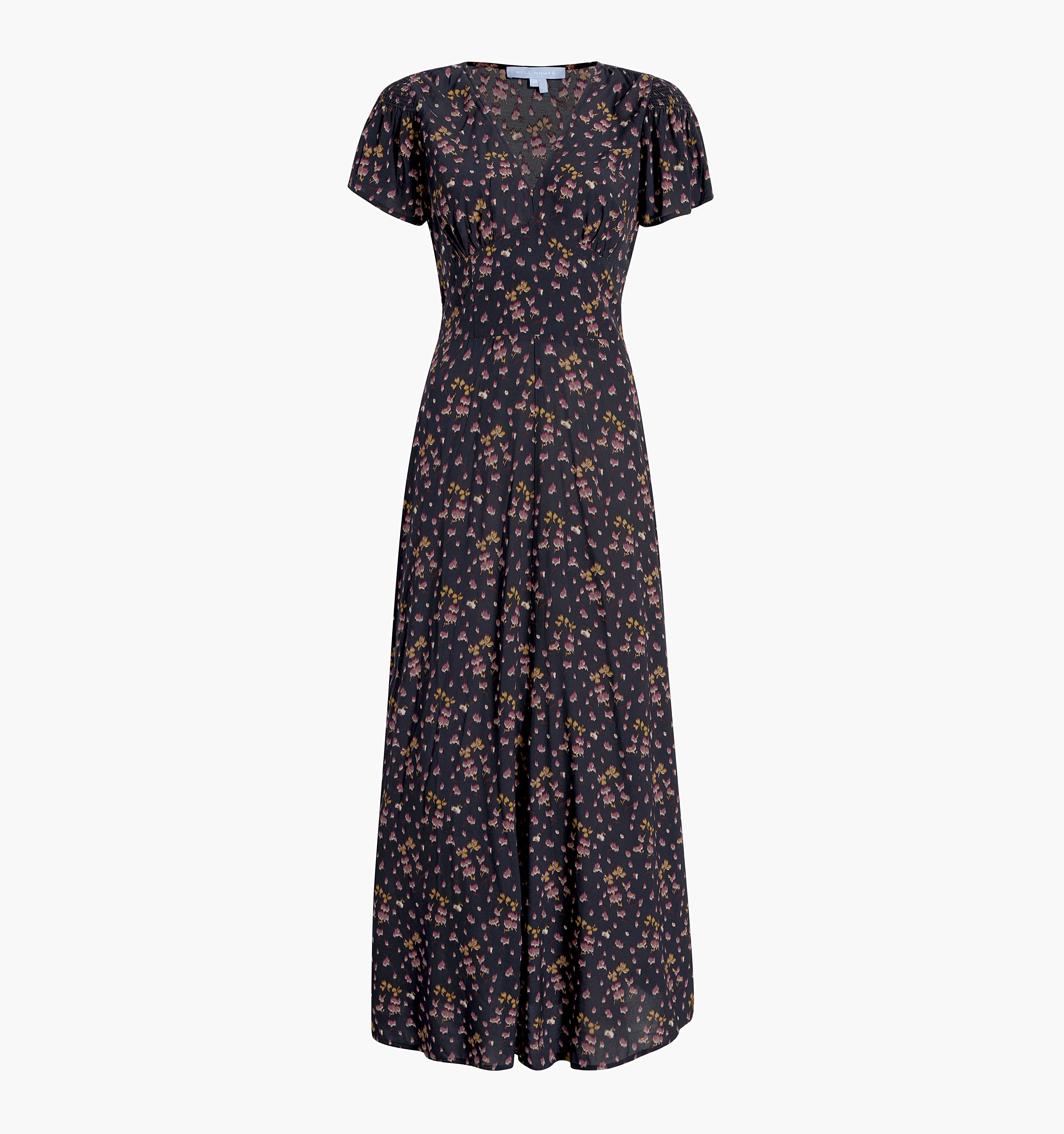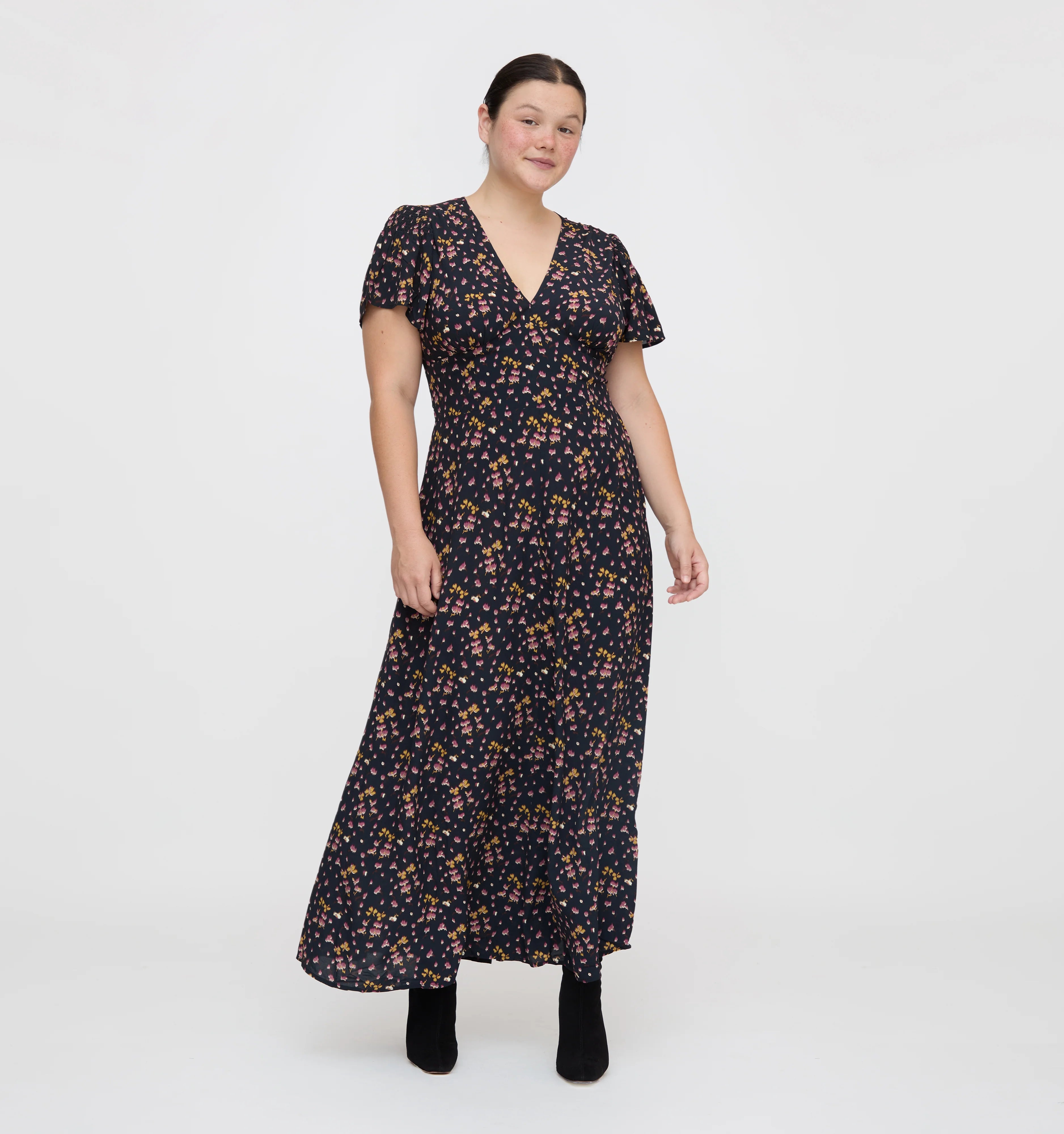 Meet the Rae Dress. Rae’s slim maxi skirt, subtle v-neck and flutter sleeves make it the perfect 9-5 look. The shoulders are capped with a sweet, smocked detail for an extra comfortable fit and soft silhouette.