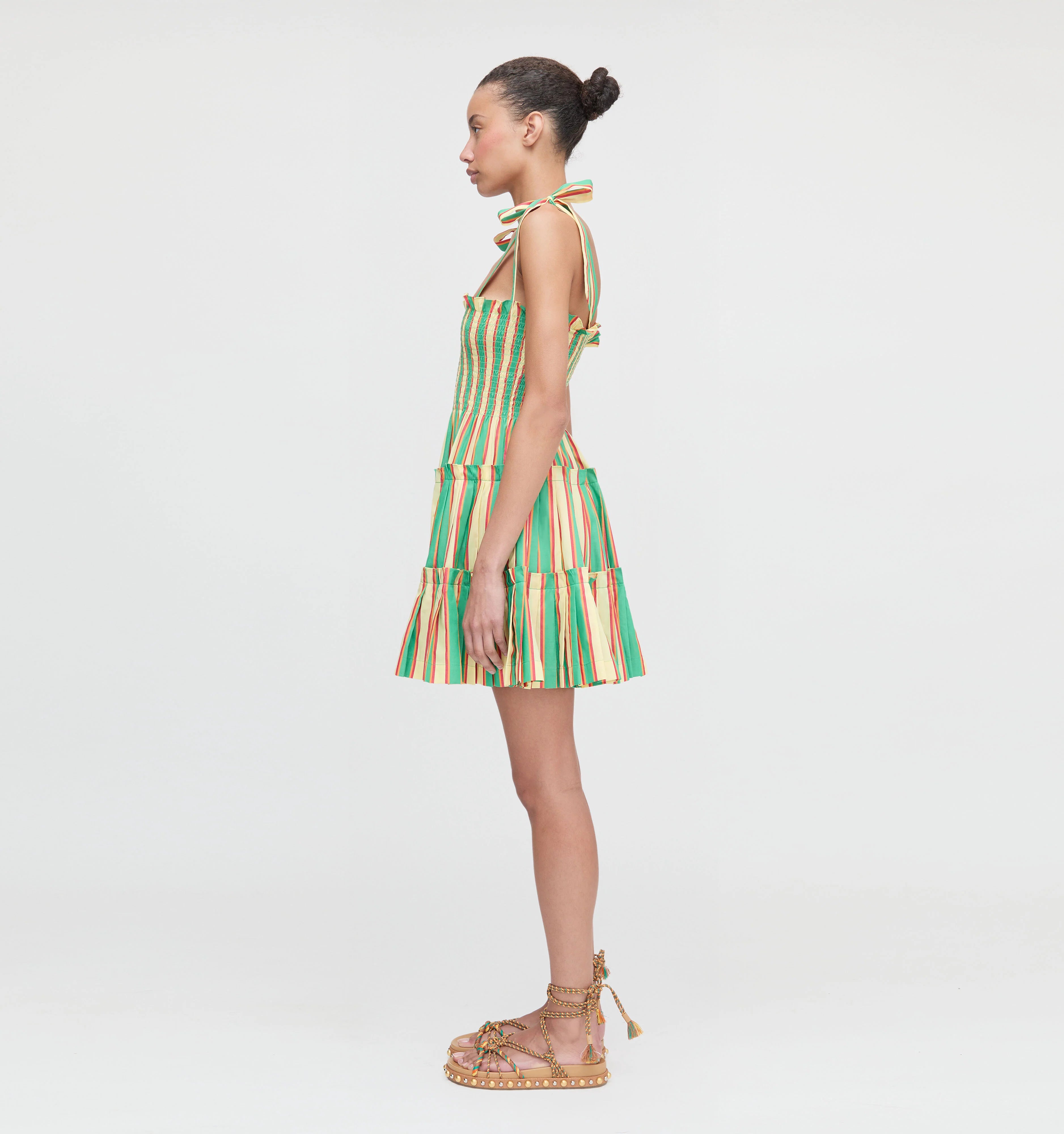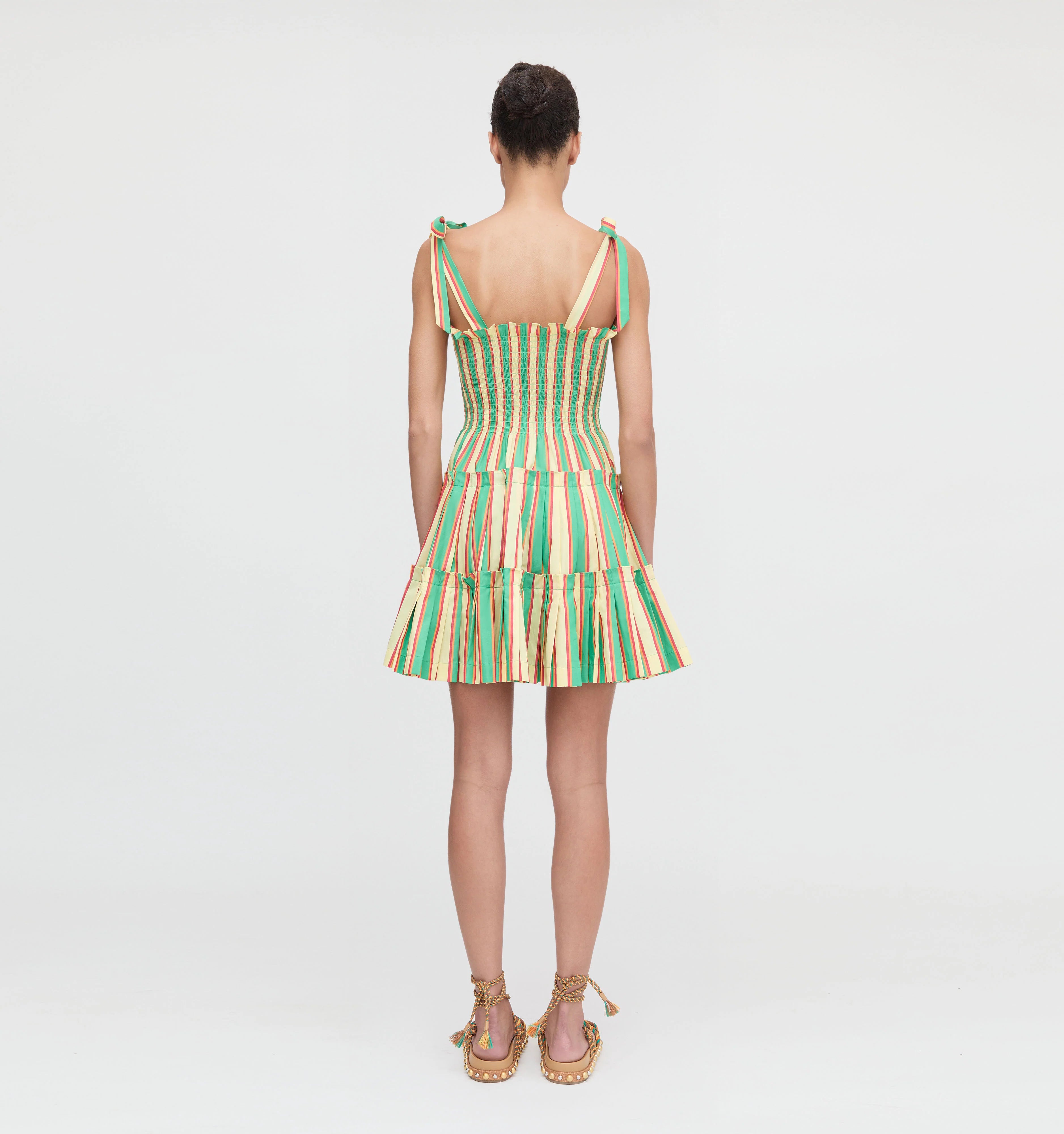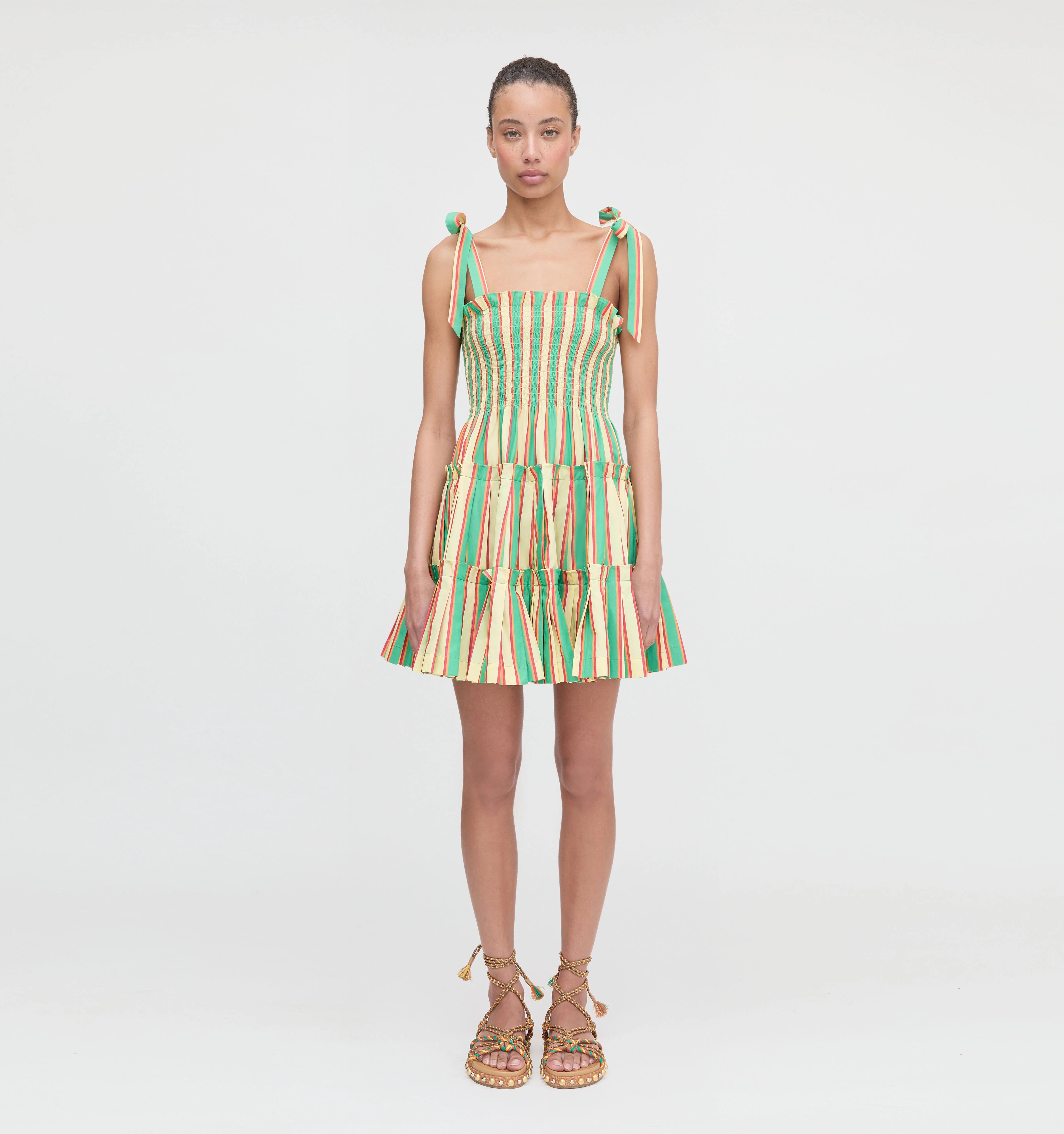 Meet the Charlotte Ribbon Nap Dress. Charlotte’s power lies in the mini, pleated skirt. To the naked eye it may look like a simple tiered skirt, but oh – the pleats! Combined with two ruffled tiers, the pleats give this mini skirt max volume for a flirty flare. A square neckline and fully smocked bodice make it as comfortable as it is chic. The straps are self-tie – creativity is highly encouraged. Big bows, little bows, tie it in the bow for no bows, the choice is yours.