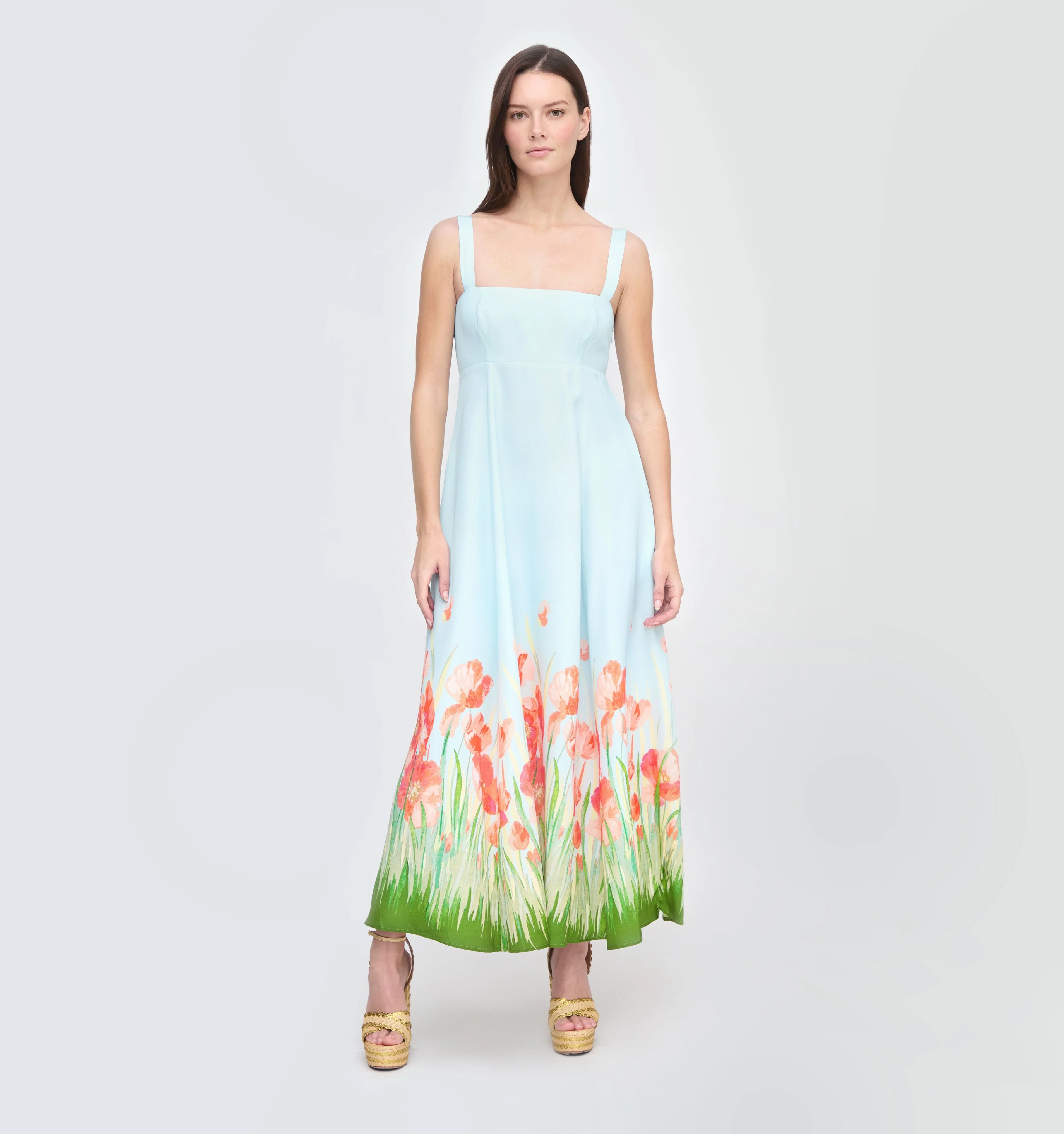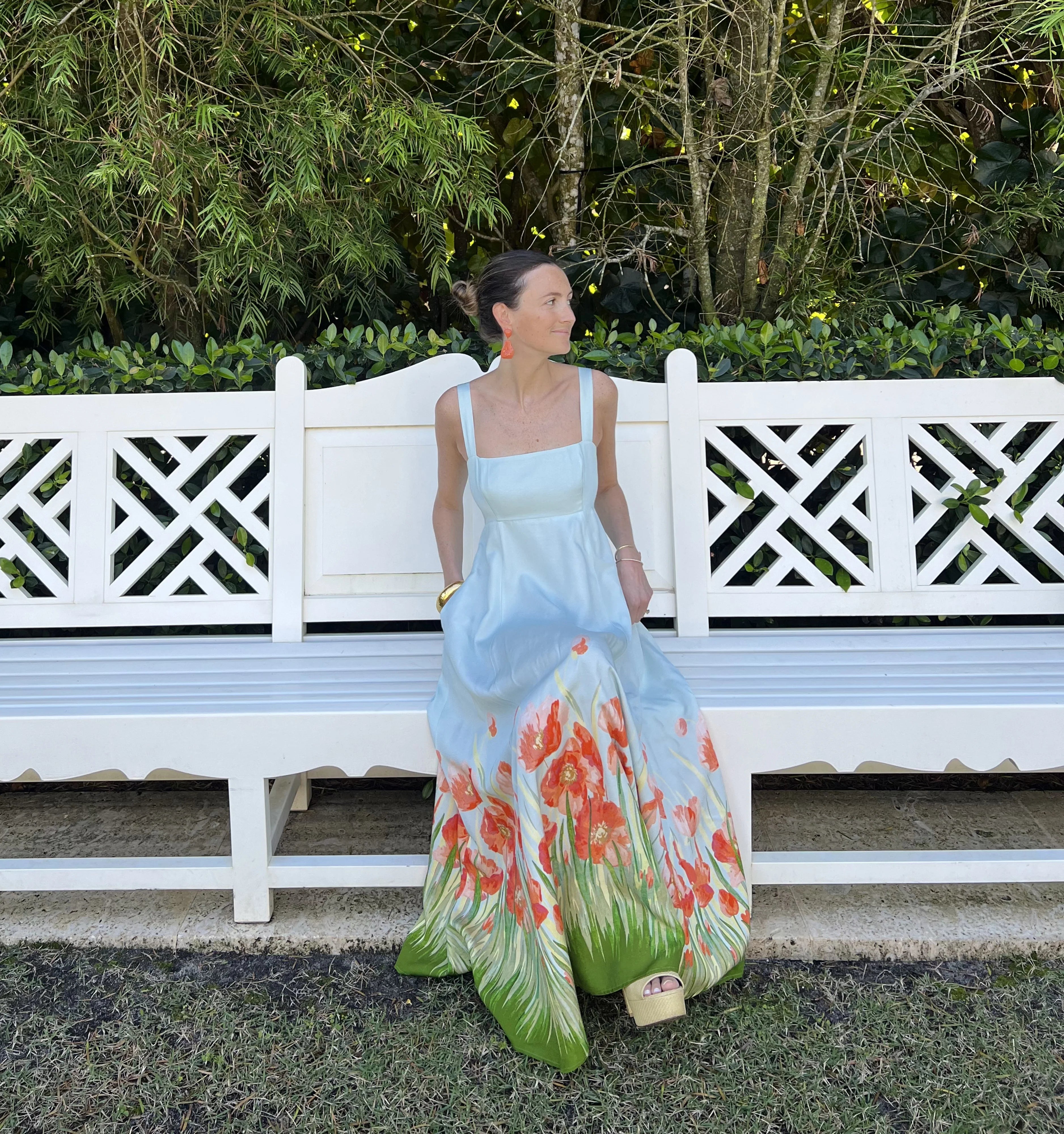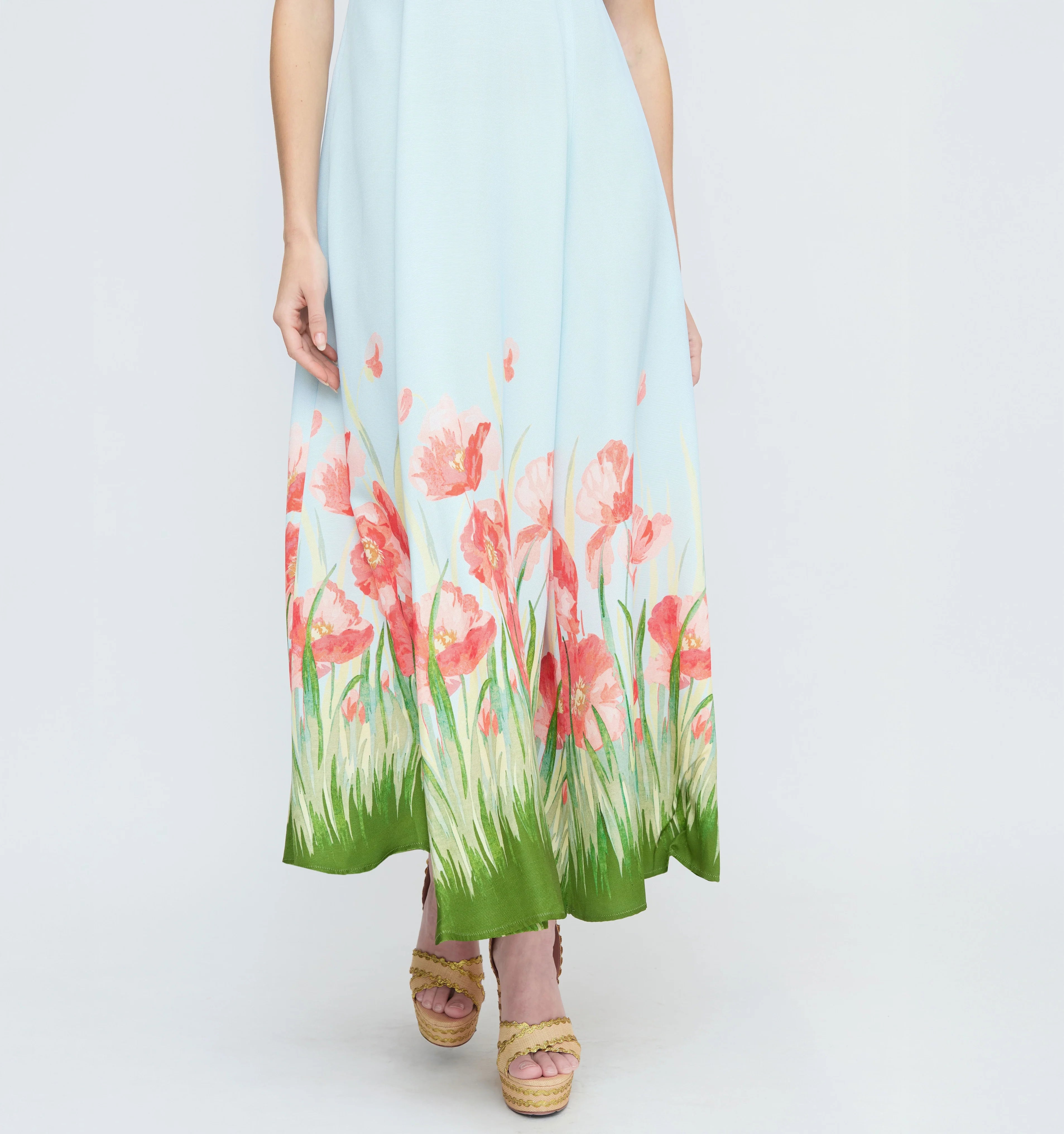 Meet the Rowena Dress. Rowena is the sister style to our Matilda dress; she’s Matilda without the puff sleeves. The Rowena has a fitted empire waist which flares into a full skirt featuring a scene of watercolor poppy flowers and green grass against a light blue ground.