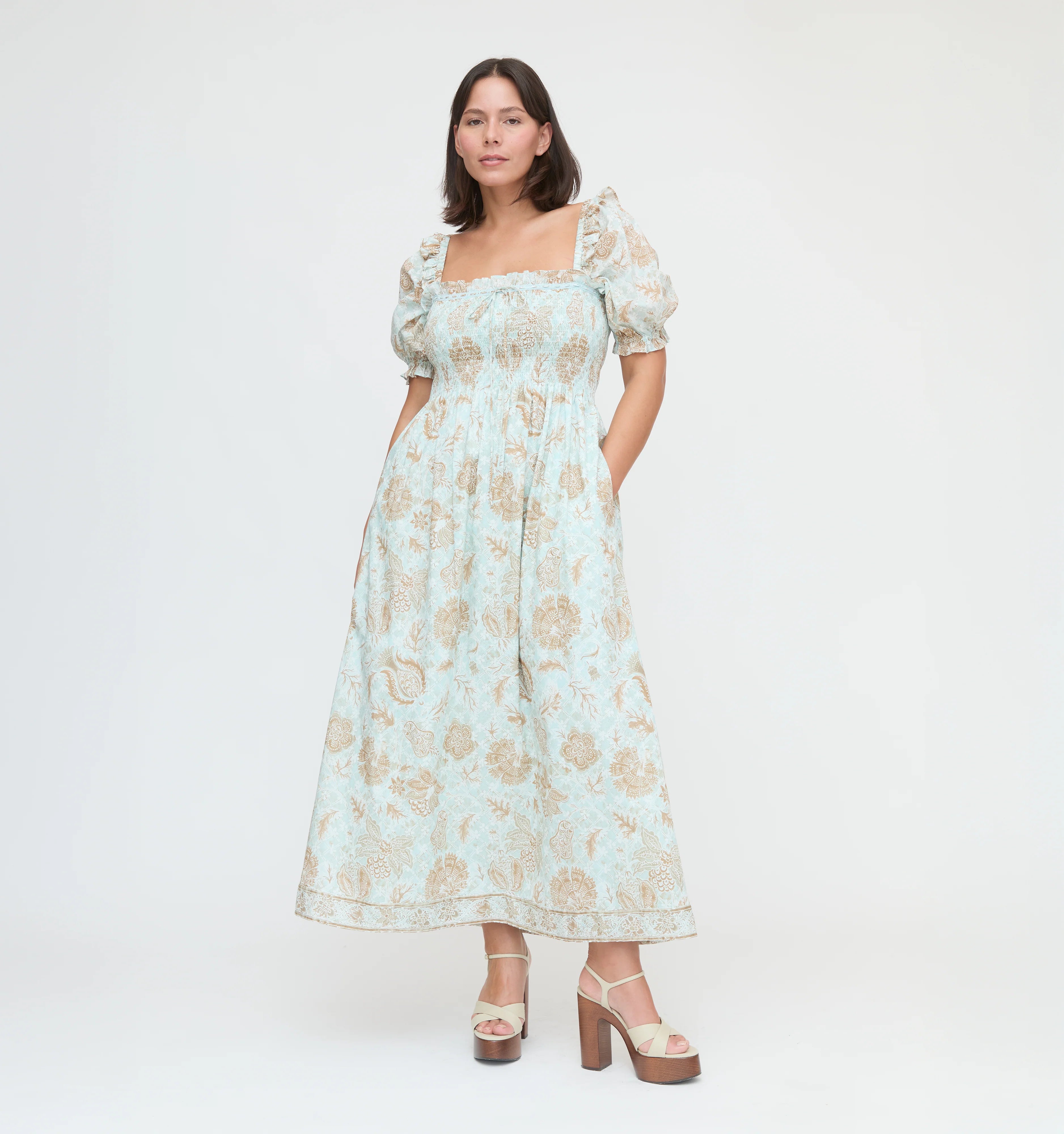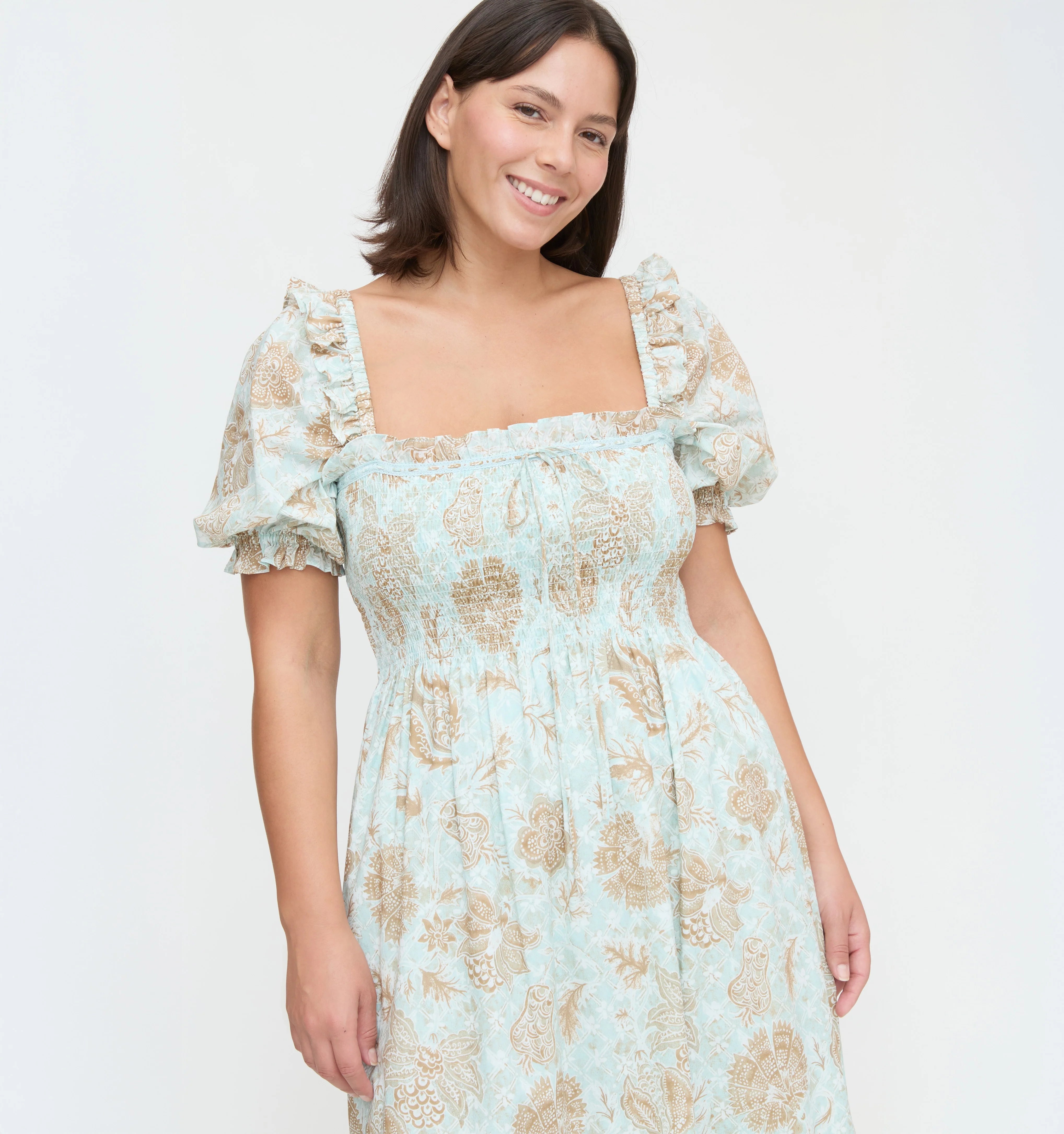 Meet the Scarlett Nap Dress. Our Founder, Nell, calls this dress her “new Ellie”; a closet-staple she can wear a million ways. Scarlett features our proprietary, elasticated Nap Smocking, a slim skirt that hits around the ankle, puff sleeves and lace detailing at the neckline. Our favorite part? The tiny shoulder ruffle, a nod to big sis Ellie and her iconic shoulders.