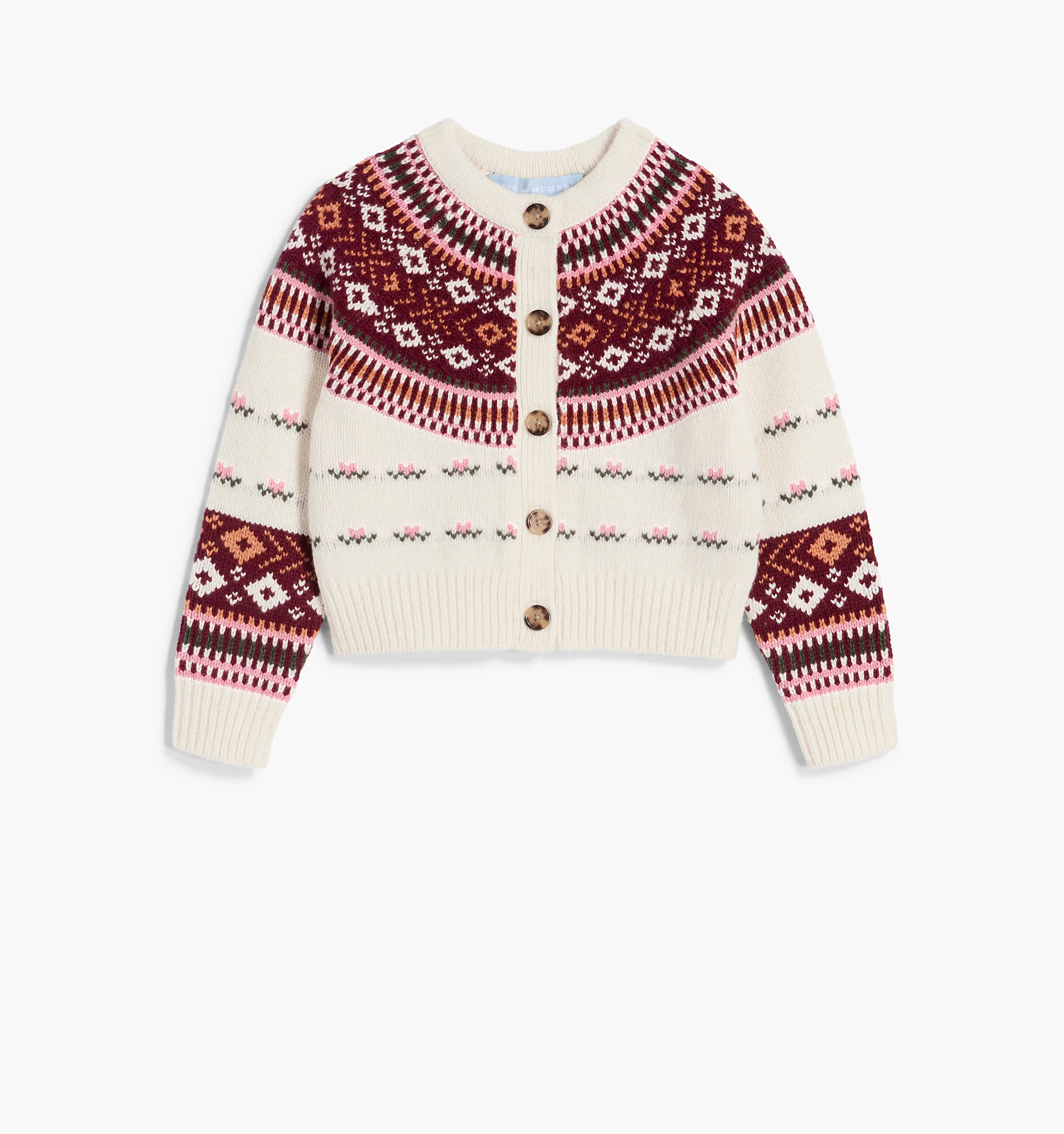 Meet the Tiny Ren Cardigan. We took our best-selling Ren Cardigan and made it Tiny. This cozy wool blend cardigan features a classic, woven Fair Isle design and tortoise buttons up the front.