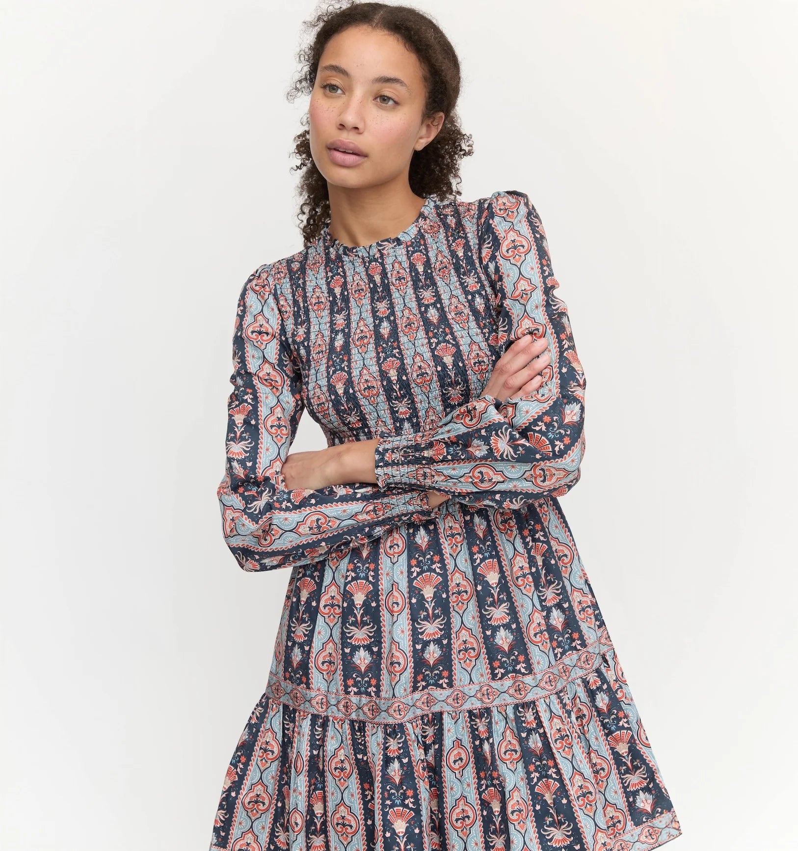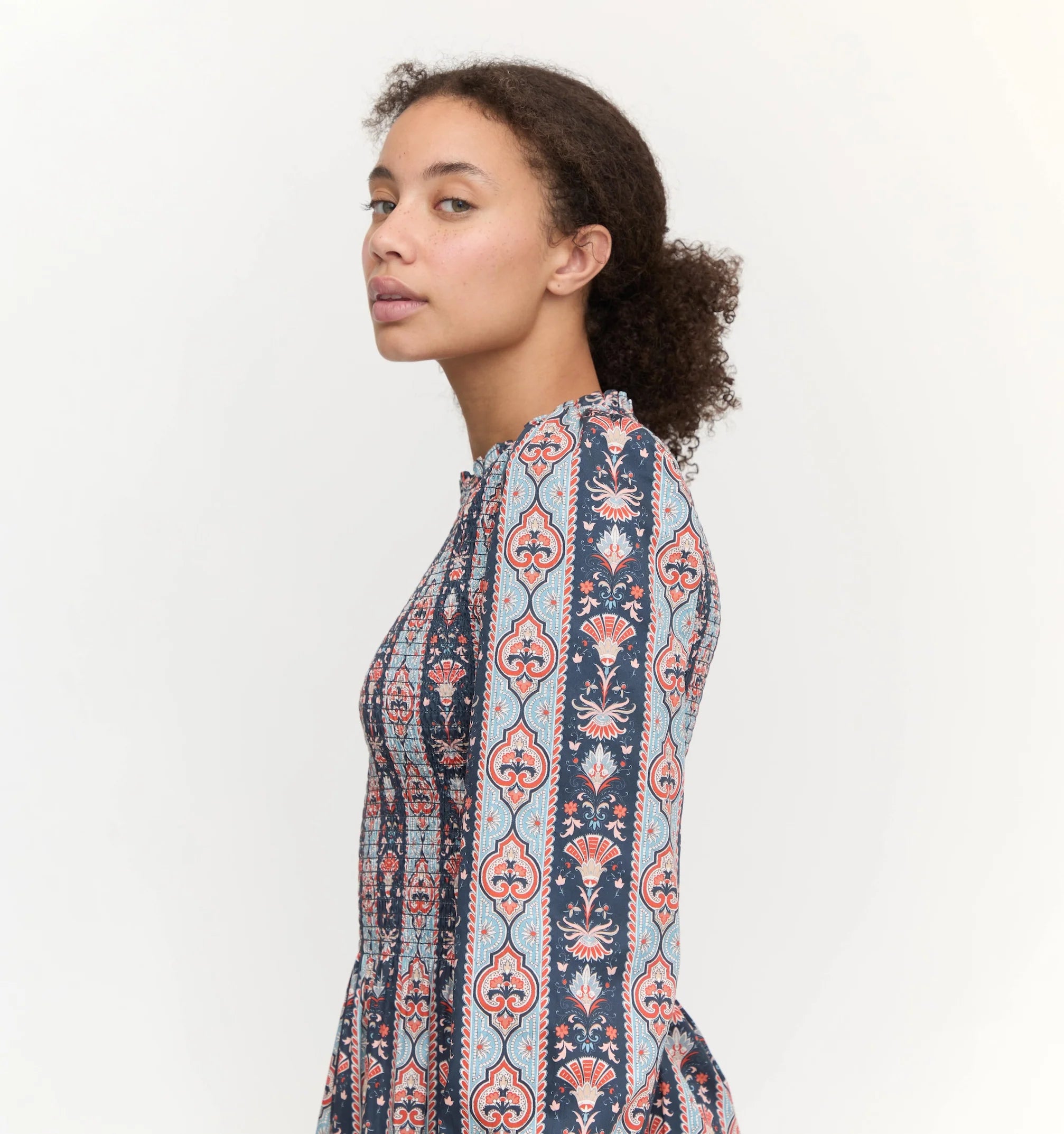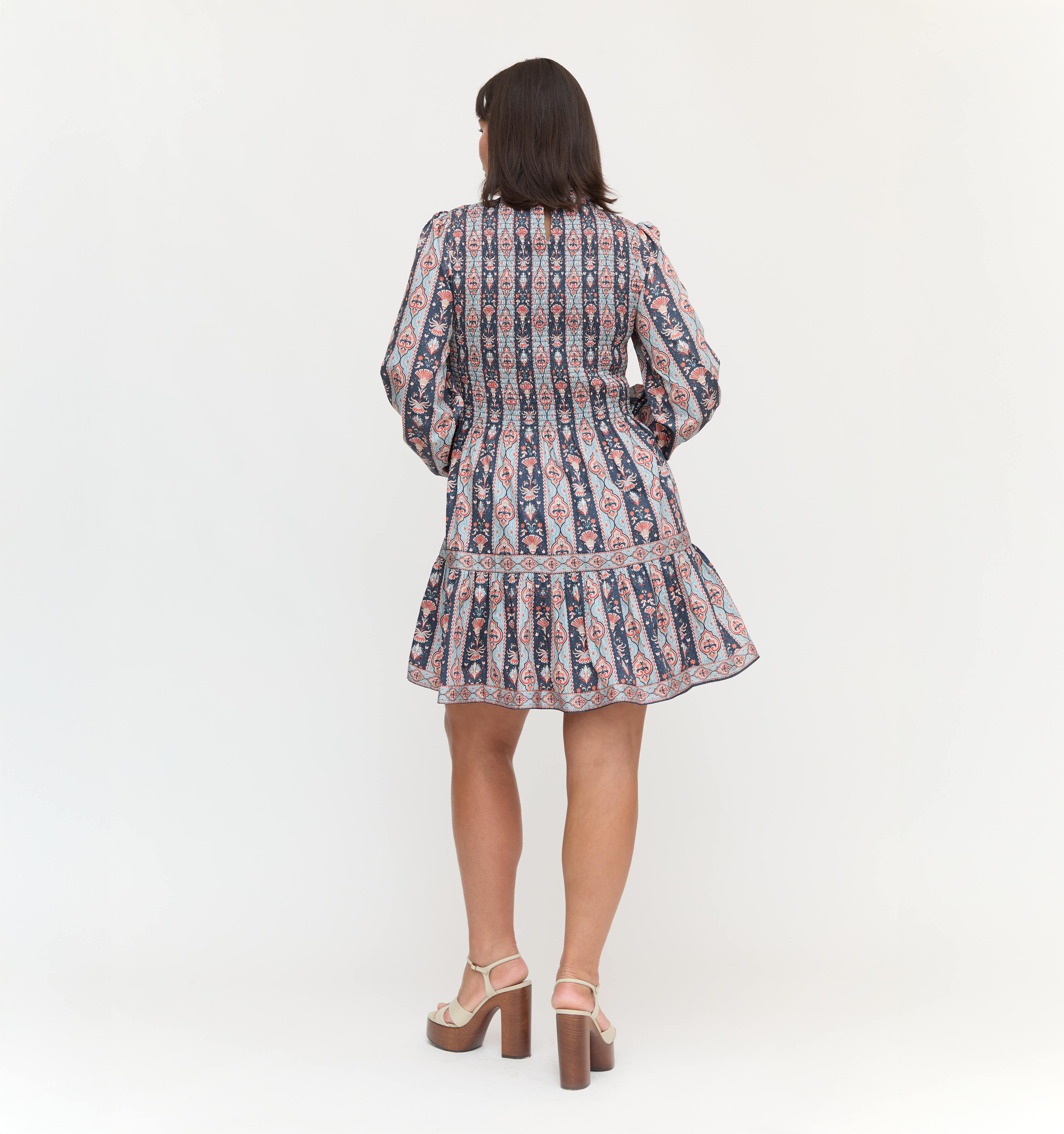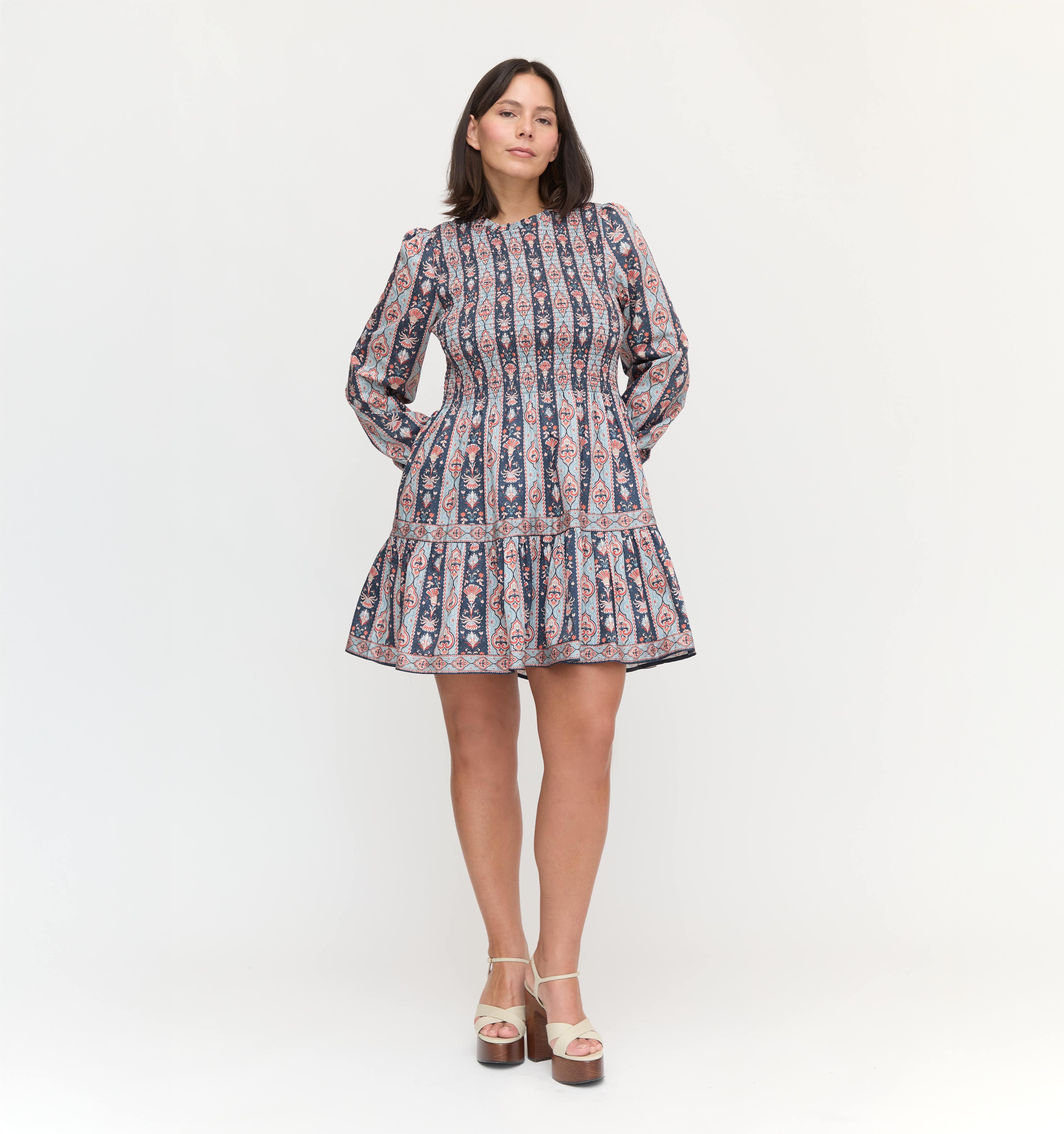 Meet the Viviana Mini Nap Dress. The Viviana Mini features the best of her maxi counterpart -- long sleeves, a flattering waist moment thanks to our elasticated, proprietary Nap Smocking and a bra-friendly high neck -- in a new mini length. Style with an opaque black tight and black boot now and a colorful ballet flat later.
