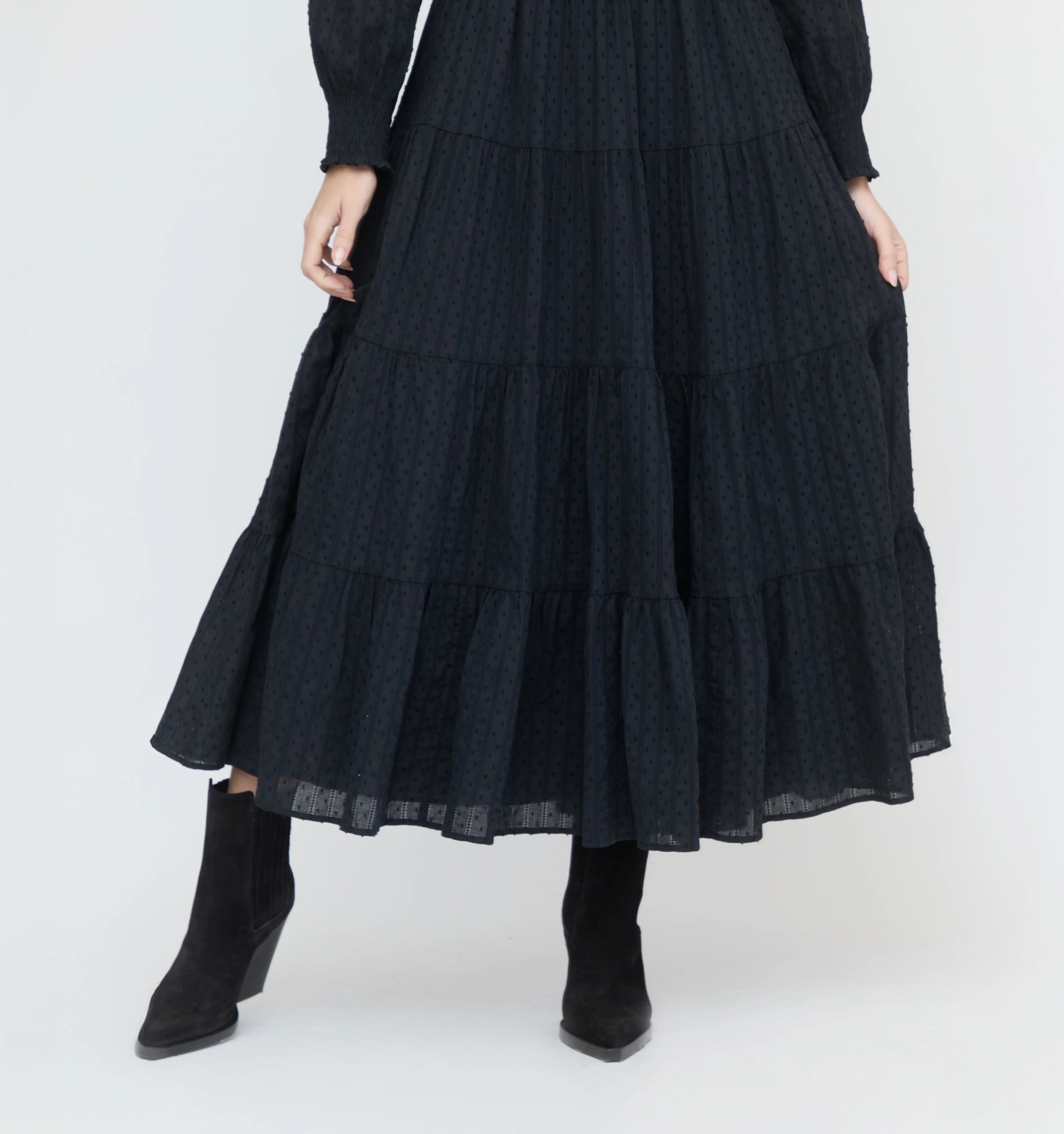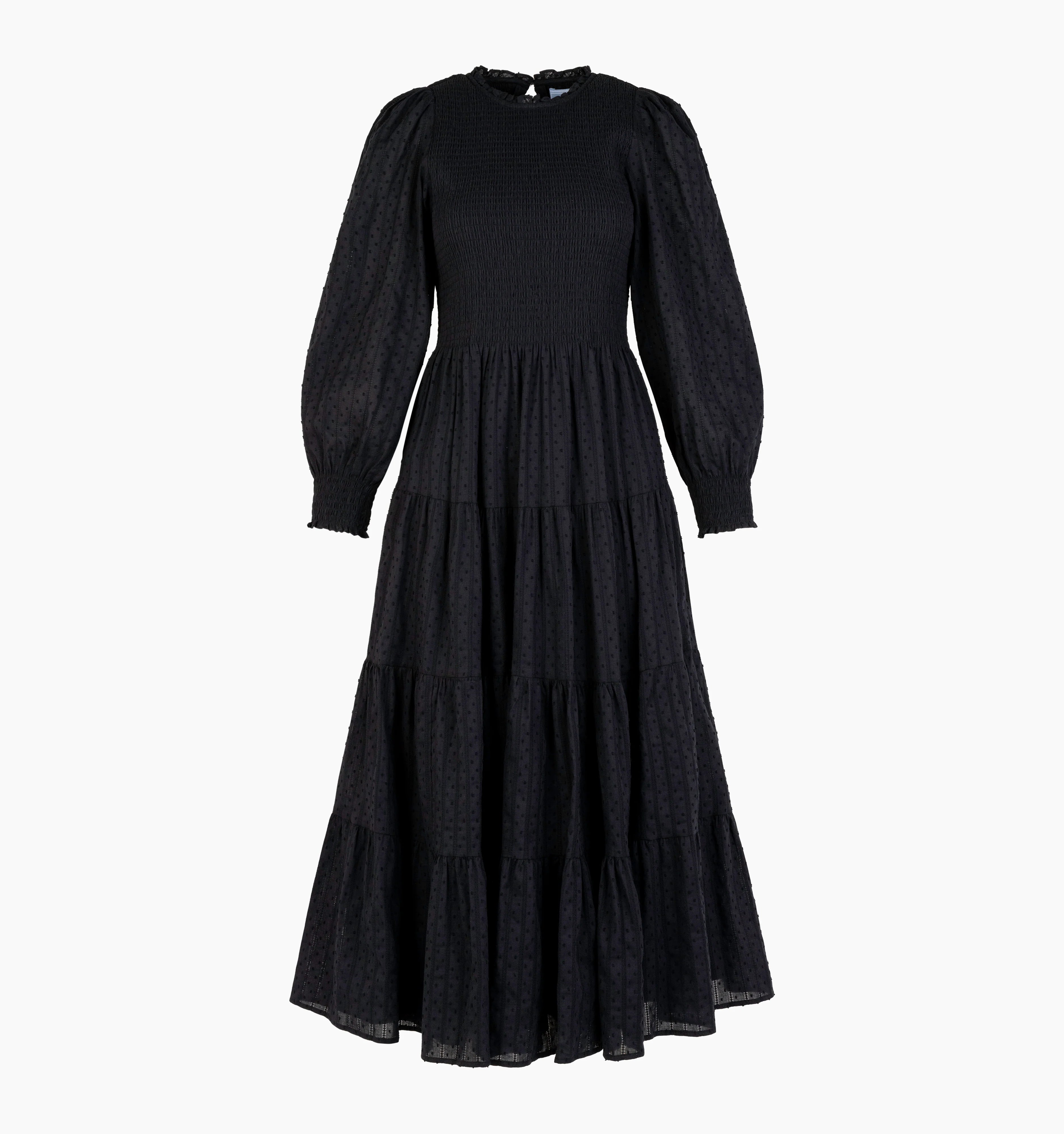 Meet the Viviana Nap Dress. Viviana features the best of a winter dress. Long sleeves, a flattering waist moment thanks to our elasticated, proprietary Nap Smocking, tiered midi skirt and a bra-friendly high neck. Dress it up with layered necklaces and a heeled boot or throw it on for your day-to-day with a favorite flat.