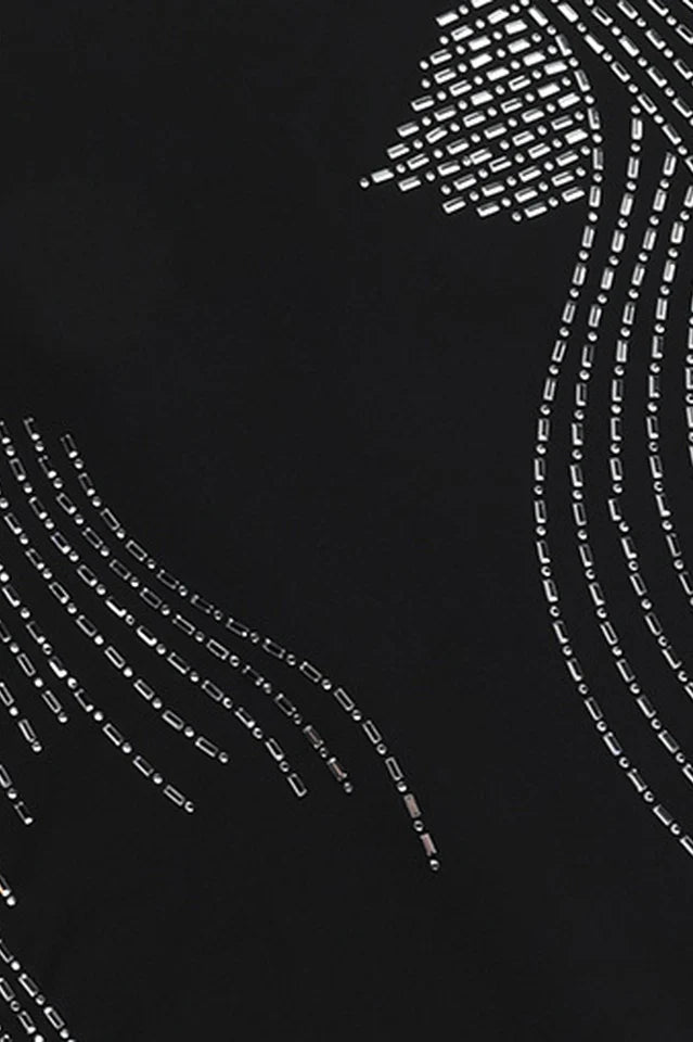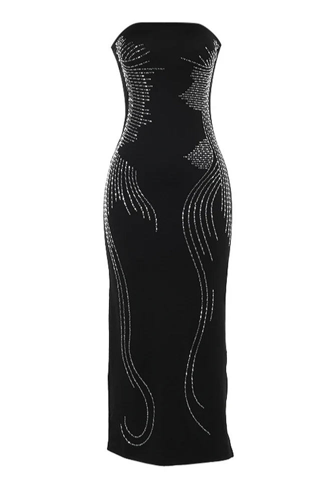 Introducing the 'Disturbia' Embellished Maxi Dress in Black! This stunning black dress features an embellished pattern that adds a touch of glam to the classic maxi style. With a flattering strapless design and bodycon fit, this dress will make you feel confident and stylish for any occasion. Elevate your wardrobe with this must-have piece!