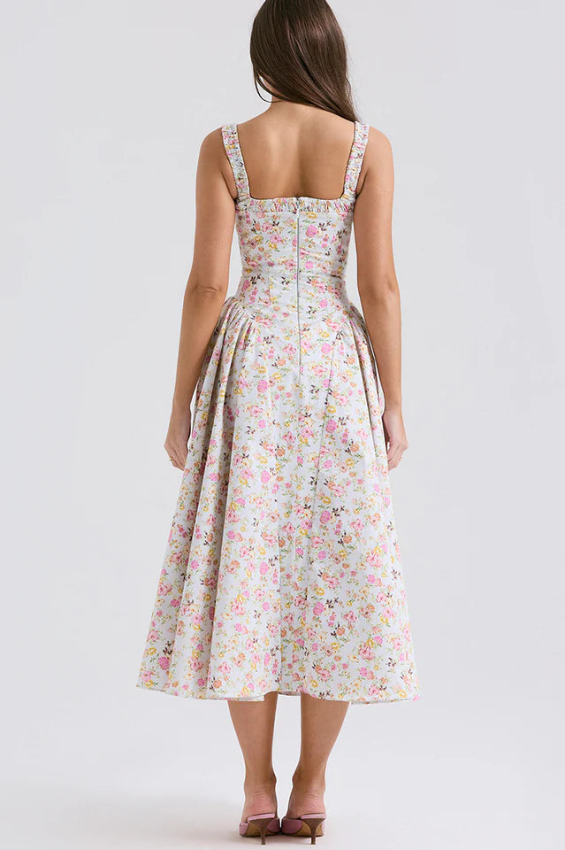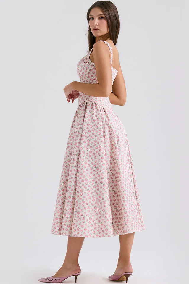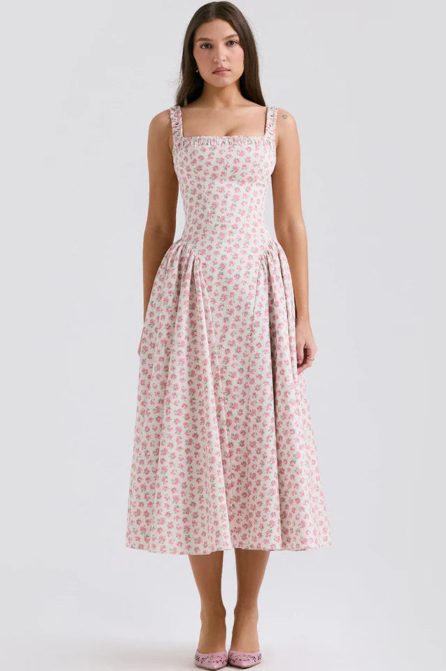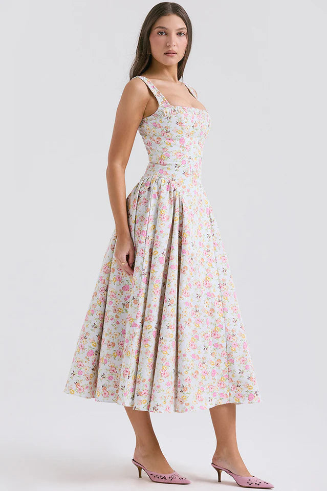 'Dorothy' is made from sustainable stretch cotton and features a delicate rose print. The sweet neckline extends to the straps, and we love that they're wide enough to hide your bra. The bodice ensures a great fit and the pretty, fluffy skirt sways beautifully with every step. The Dorothy is just a classic and charming length.