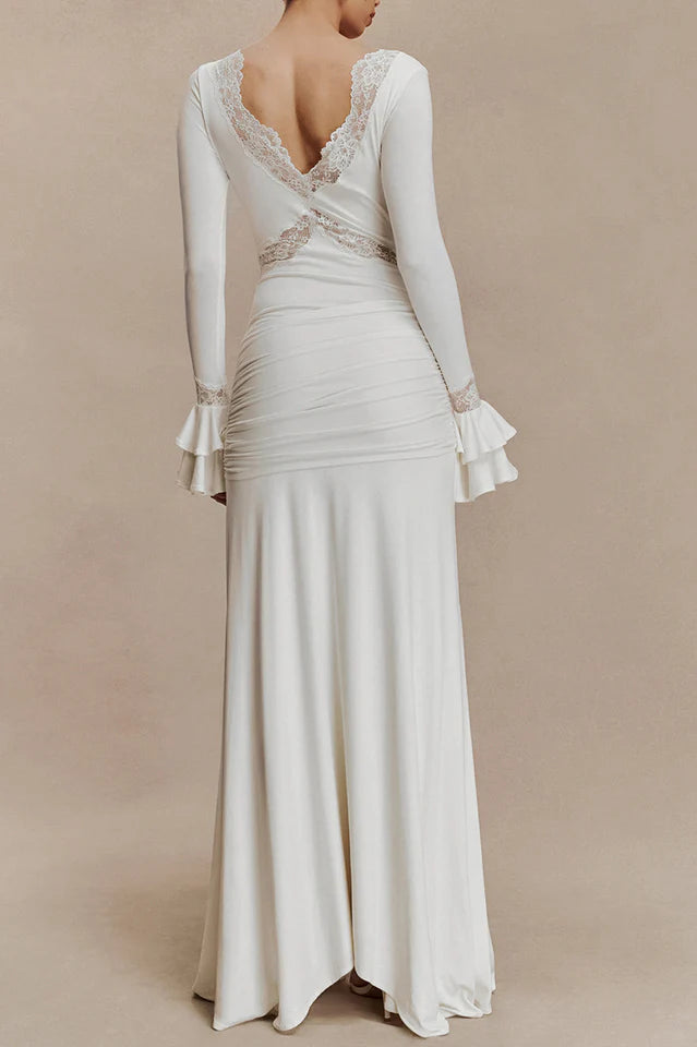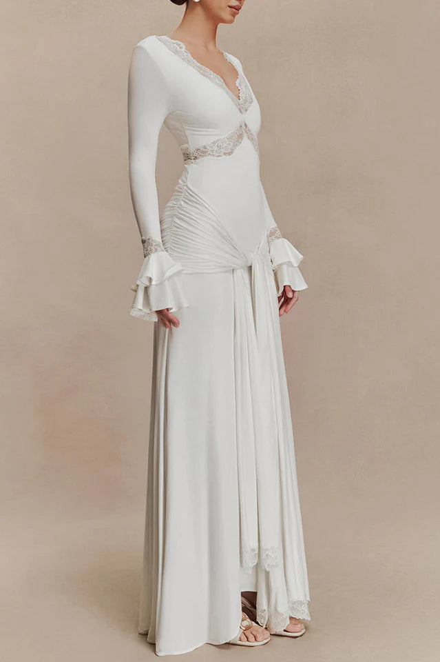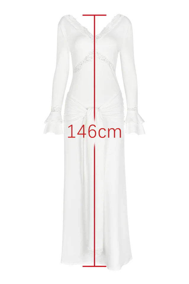 The ELECTRA Slinky Lace Maxi Dress blends sultry detail with fluid design. Featuring a deep V lace neckline and fitted silhouette, this dress hugs the body while lace cut-outs add delicate intrigue. A cascading front-side tie drape brings graceful movement, while flared layered sleeves evoke a sense of vintage romance. Partially lined for contrast and comfort, this dress is designed to turn heads—whether it’s a moonlit dinner or a statement-making soirée.