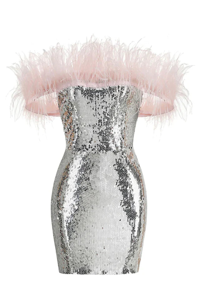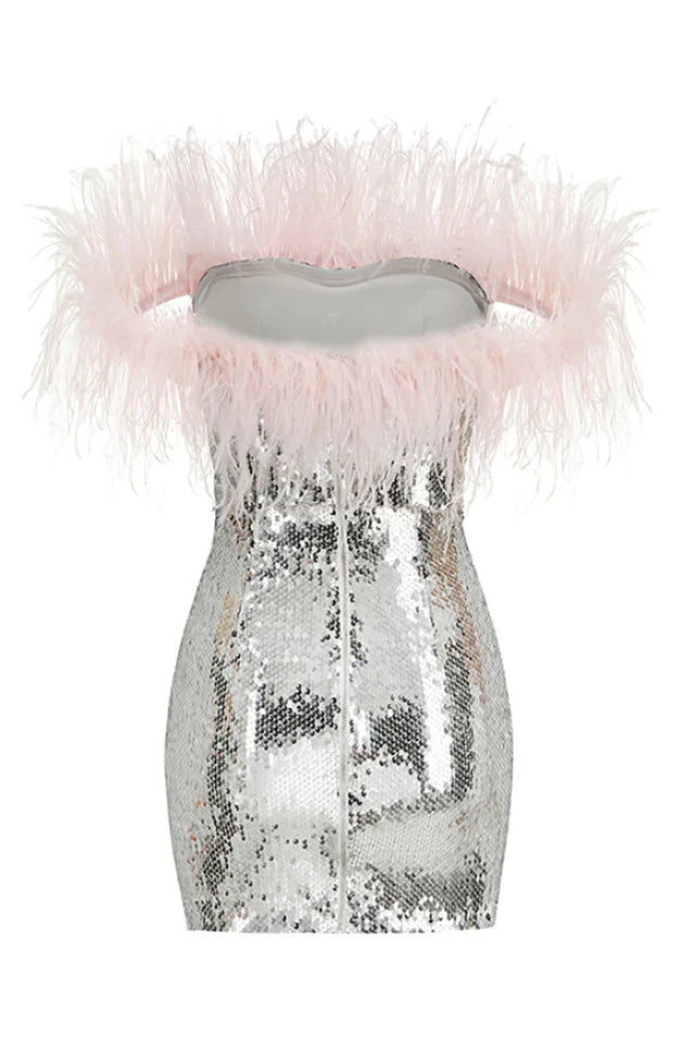This dress is a fusion of playfulness and luxury, with delicate pink feathers and shimmering silver sequins that create a captivating contrast. The off-shoulder design adds a touch of allure, while the mini length exudes youthful charm. Crafted with meticulous attention to detail, this dress is designed to make a statement at parties and special occasions.