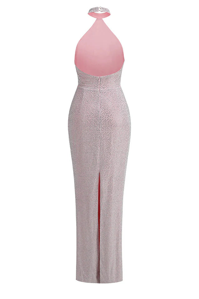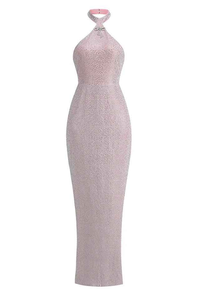 Explore timeless elegance in our haute couture long dress, featuring a sleek back slit for a touch of allure. The dress is adorned with a graceful tie around the neck, culminating in a charming bow. Adding convenience, it is finished with a discreet zipper at the back, ensuring both style and ease of wear.