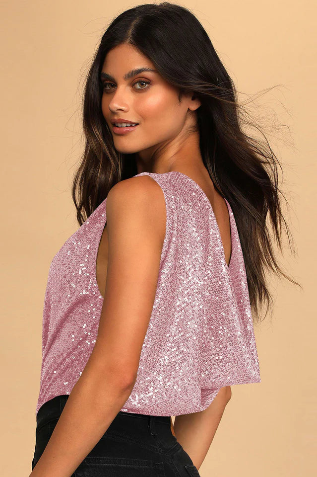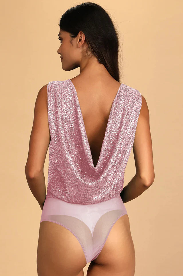 You'll be a vision of party-ready perfection in the Evening of Wonder Sequin Cowl Back Bodysuit! Glistening sequins (atop a matching mesh lining) cover a sexy surplice neckline, a sleeveless bodice, and a dramatic cowl back. Attached mesh bottoms have cheeky coverage and snap closures.