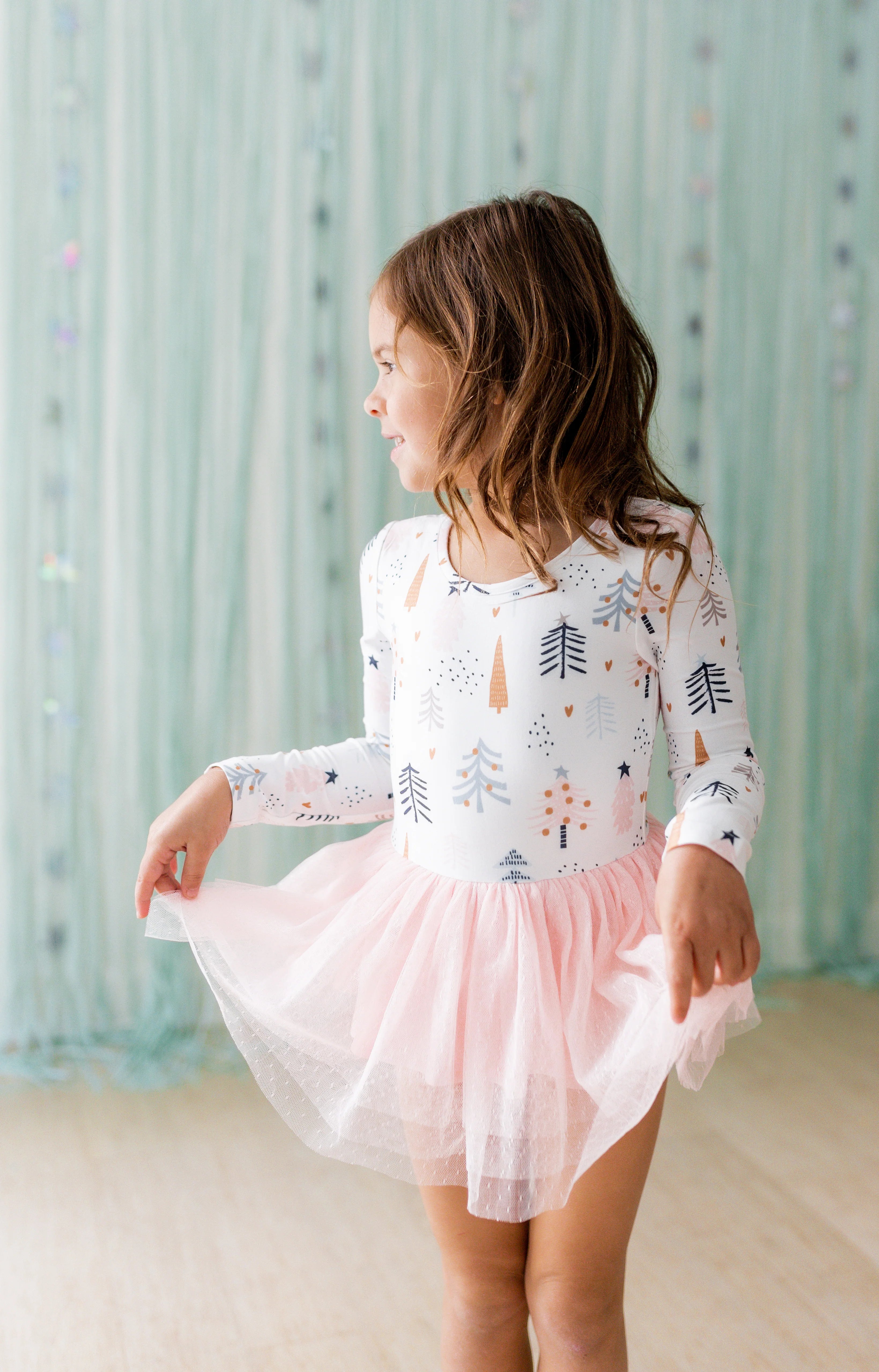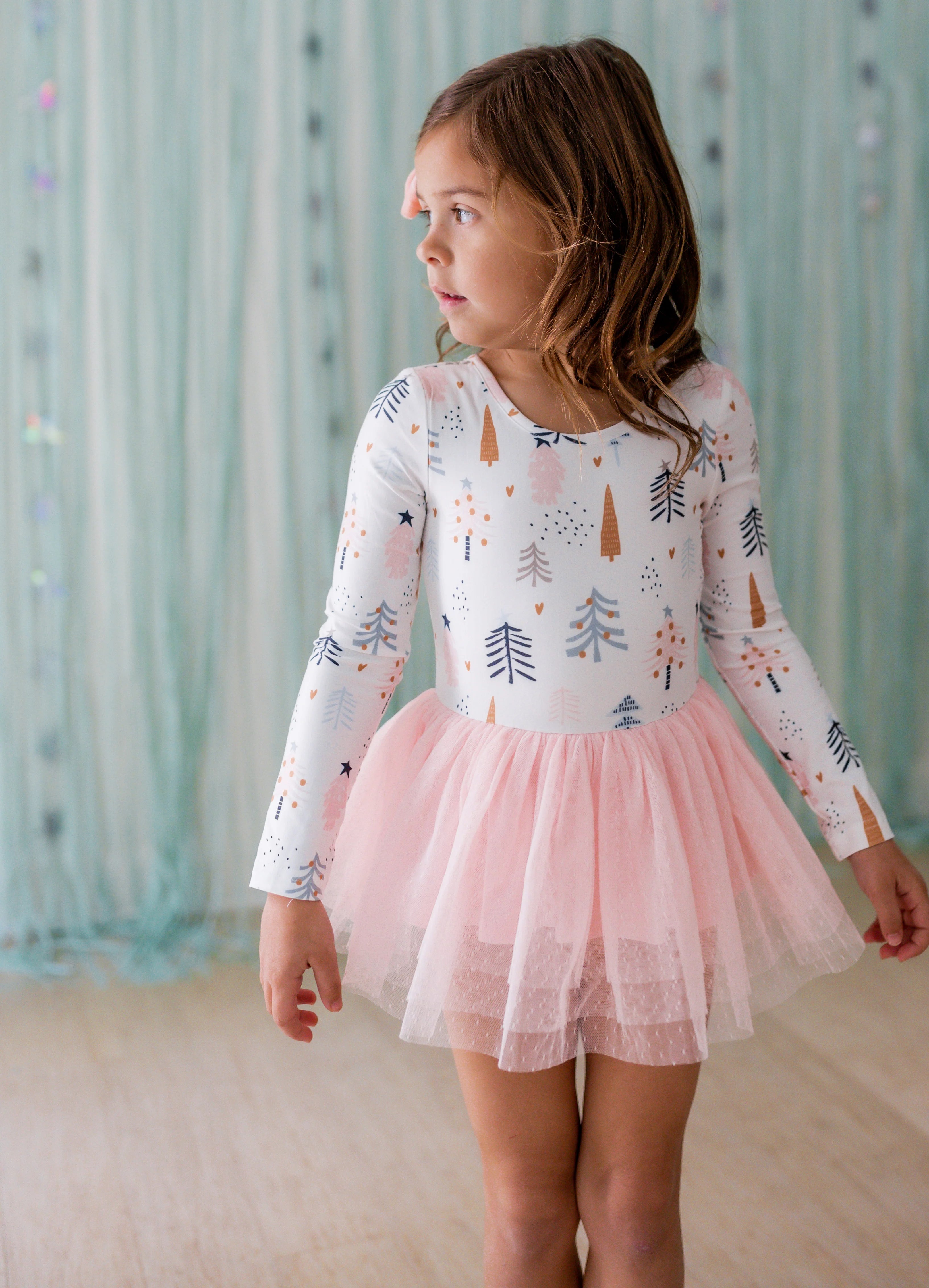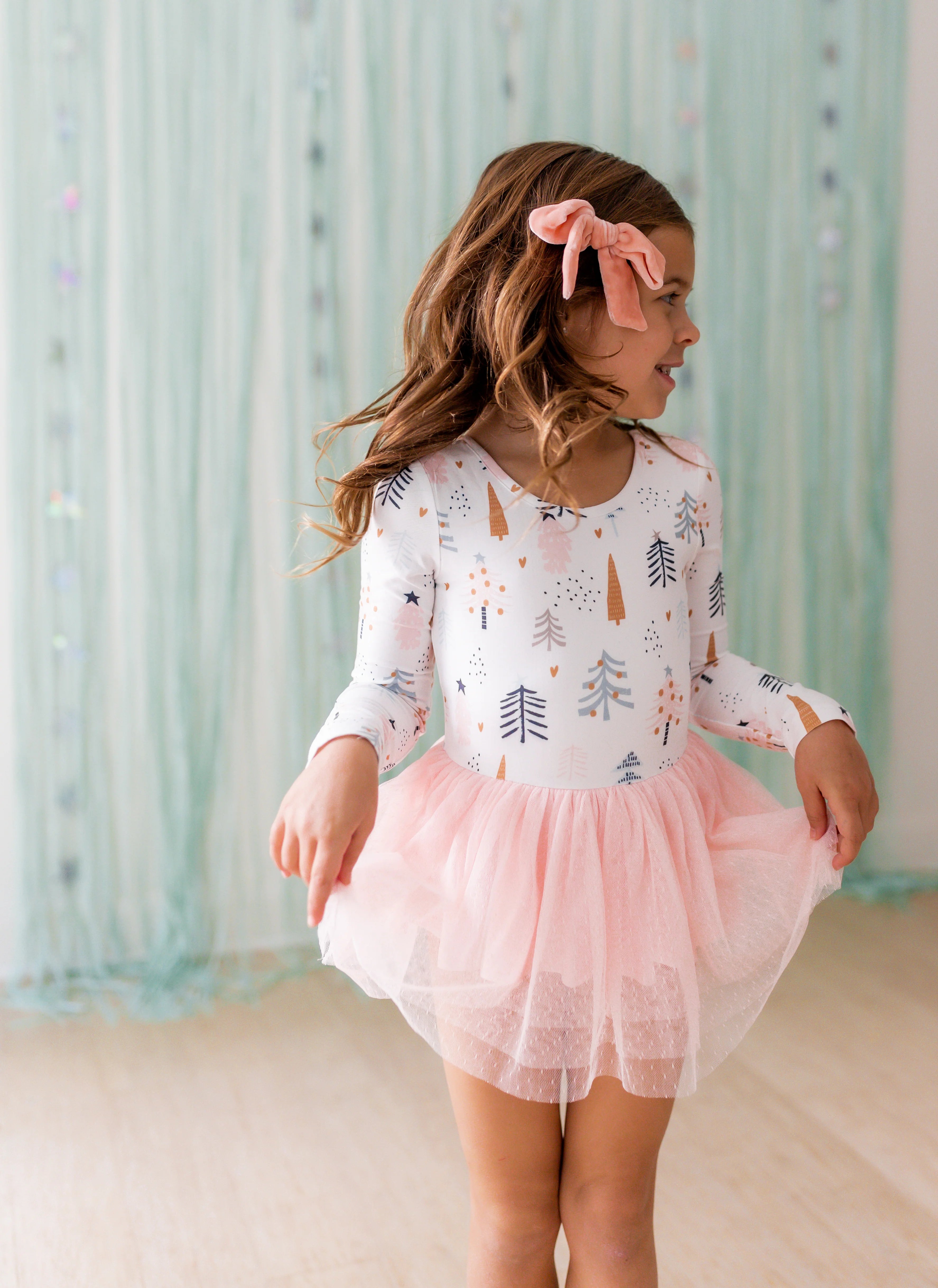 Celebrate the season in style with the Farrah Tier Leotard in Blush Tinsel. Featuring a soft pink skirt and a playful tree print, this leotard brings festive fun to every twirl. Designed for comfort and movement, it’s perfect for dance classes or holiday performances, making your little girl’s holiday moments unforgettable.