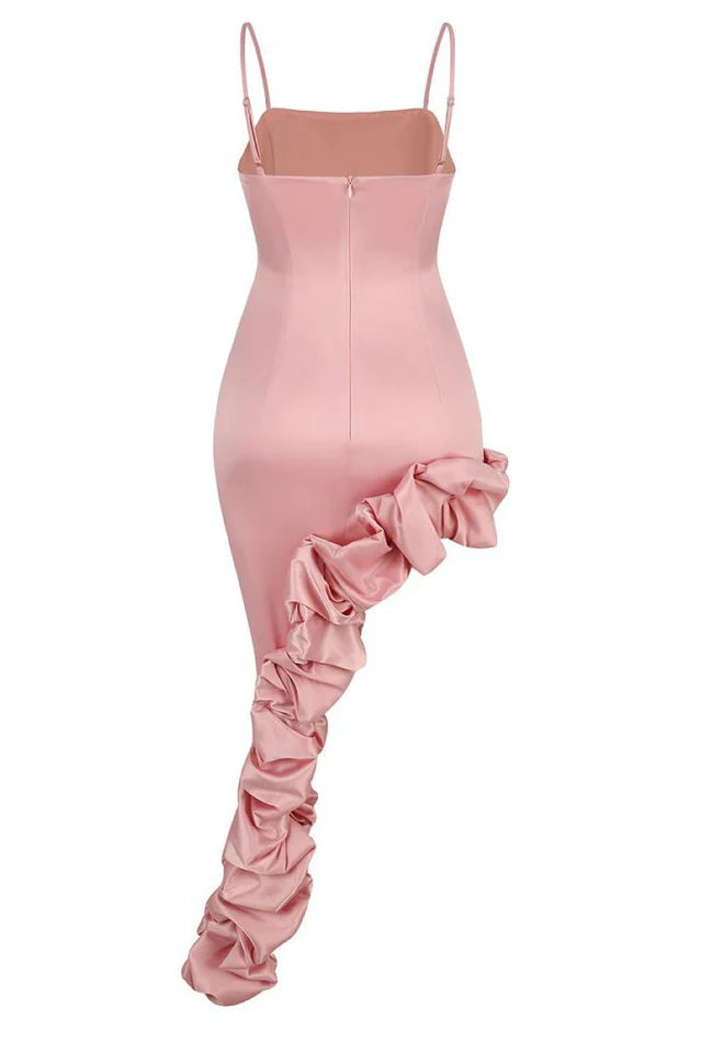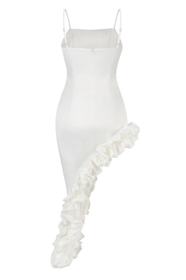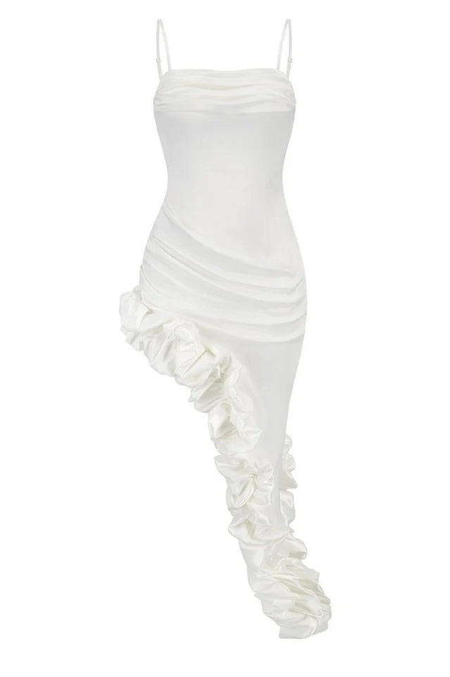 For a fitted dress with a feminine flourish, you needn't look further than Florence. Designed in a luxurious weighted satin, this midi dress highlights your best features with a draped cowl neckline and an asymmetric skirt finished with a trim of voluminous ruffles. Florence would be a gorgeous wedding guest option especially when styled with some warm gold hoops.