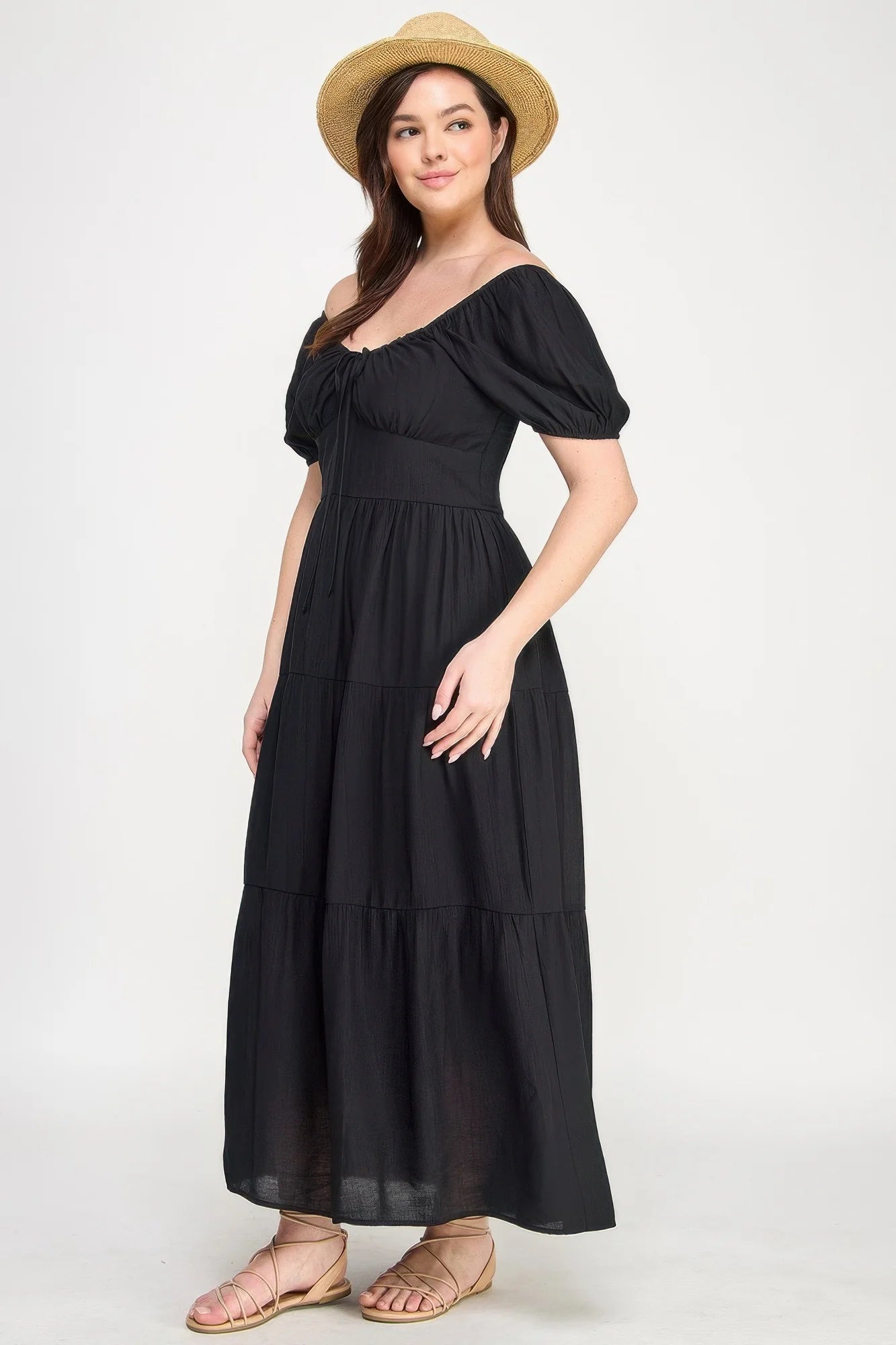 Add the Front Tie Puff Sleeve Tiered Maxi Dress in Black to your collection today for the perfect combination of playful style and all-day comfort!