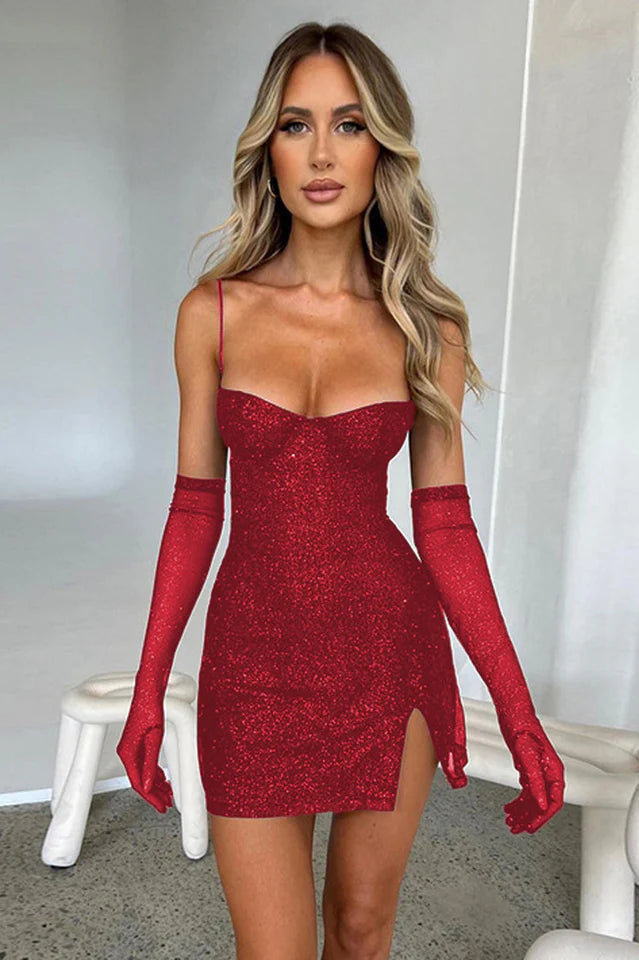 Say hello to our Georgia shiny dress, the must-have style of the season for parties where you know you’ll stand out. Fully embellished with glitter that sparkles under the dancefloor spotlights, The dress features a bust-flattering halter neckline. The gloves add to the grace. We know you’ll be obsessed with our Georgia shiny dress.