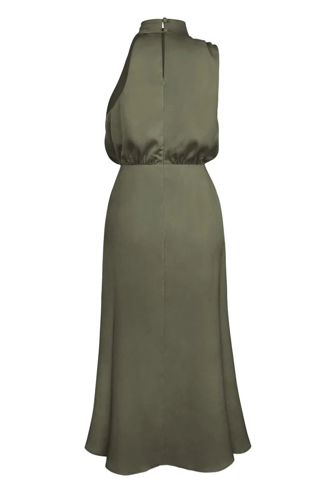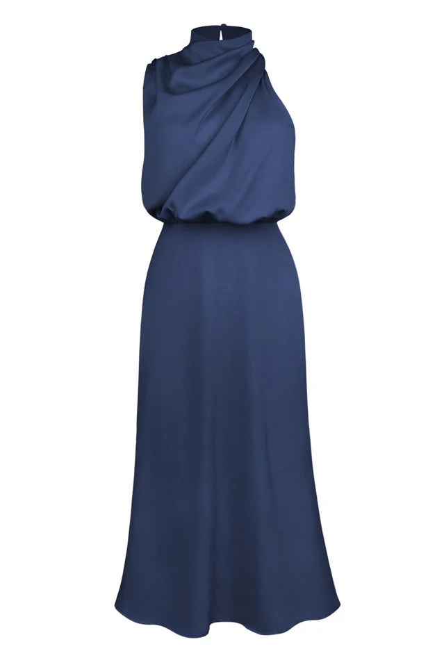 Let the vintage glam vibes move with this midi that will take you to a prestigious direction with its high neck, asymmetrical sleeves, draping details and flared skirt. Make people stare with silver heels and a glossy clutch bag!