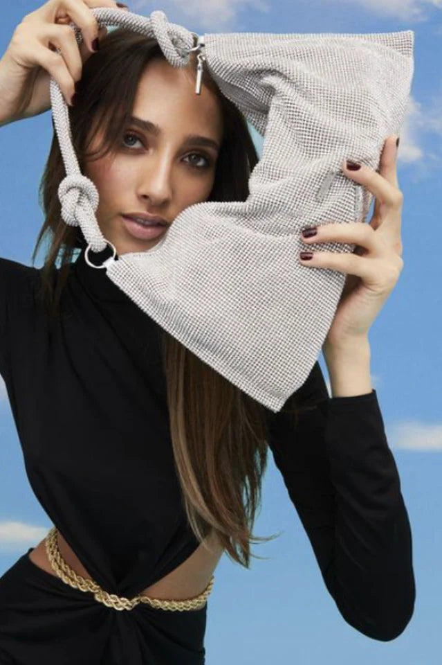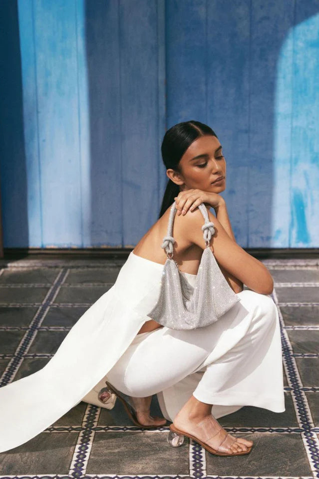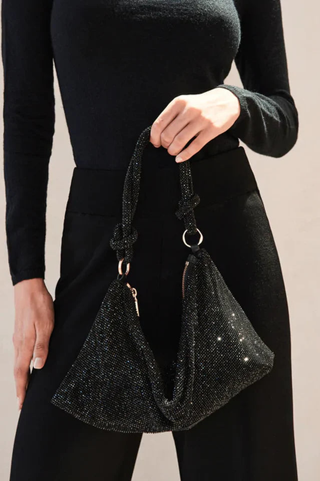 Introducing the Hera Mini Shoulder. Made from eye-catching clear rhinestones that give a metallic silver shine, it's designed with a knotted shoulder strap and a slouchy silhouette that will store all your daily essentials.