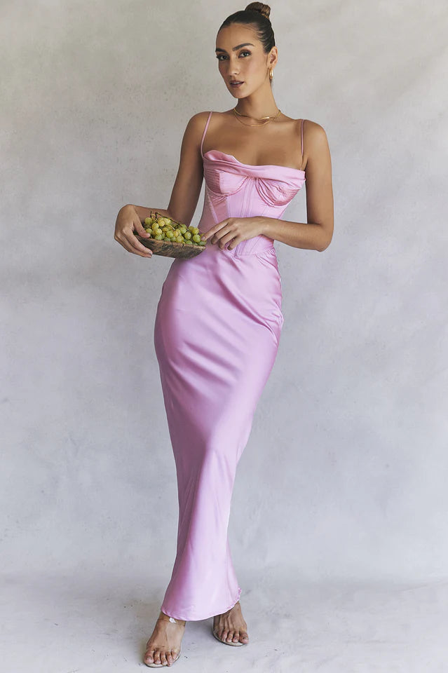 The epitome of elegance and sophistication, Herringbone Corset Dress is crafted from a delicate brown lustrous silk satin, a style that gently frames your figure. It has a beautiful plunging neckline while the bodice features our incredible bodice herringbone for a cinching fit.
