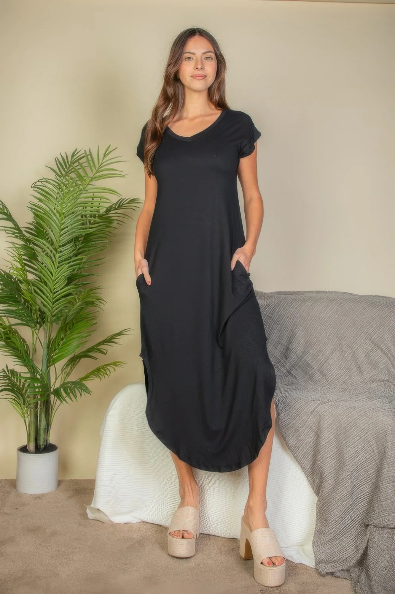 Relaxed yet refined, the Hidden Pocket Batwing Sleeve V Neck Long Dress is the perfect blend of comfort and effortless style. Crafted from ultra-soft, stretchy fabric, this maxi-length dress features short batwing sleeves and a flattering V-neckline for a breezy, feminine silhouette. Hidden side pockets add practicality without disrupting the clean lines. Ideal for everyday wear — from lounging at home to casual outings — this dress is your go-to for warm-weather ease and understated charm.