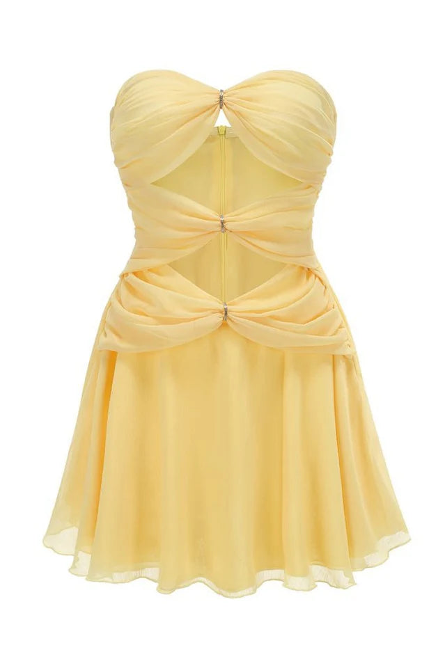 Designed with luxurious fabric, the exterior features a textured surface, gracefully swaying in the sunlight. Featuring a meticulously crafted three-pinch design on the front panel, this dress shapes an elegant curve that beautifully enhances the wearer's silhouette.
