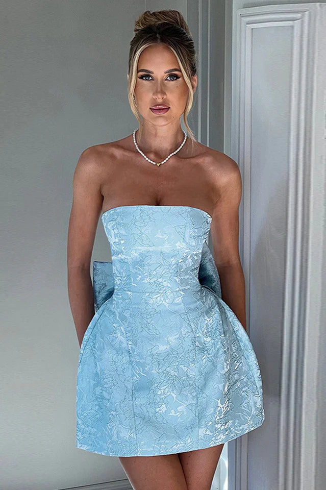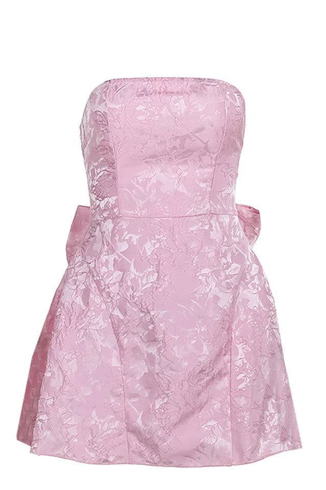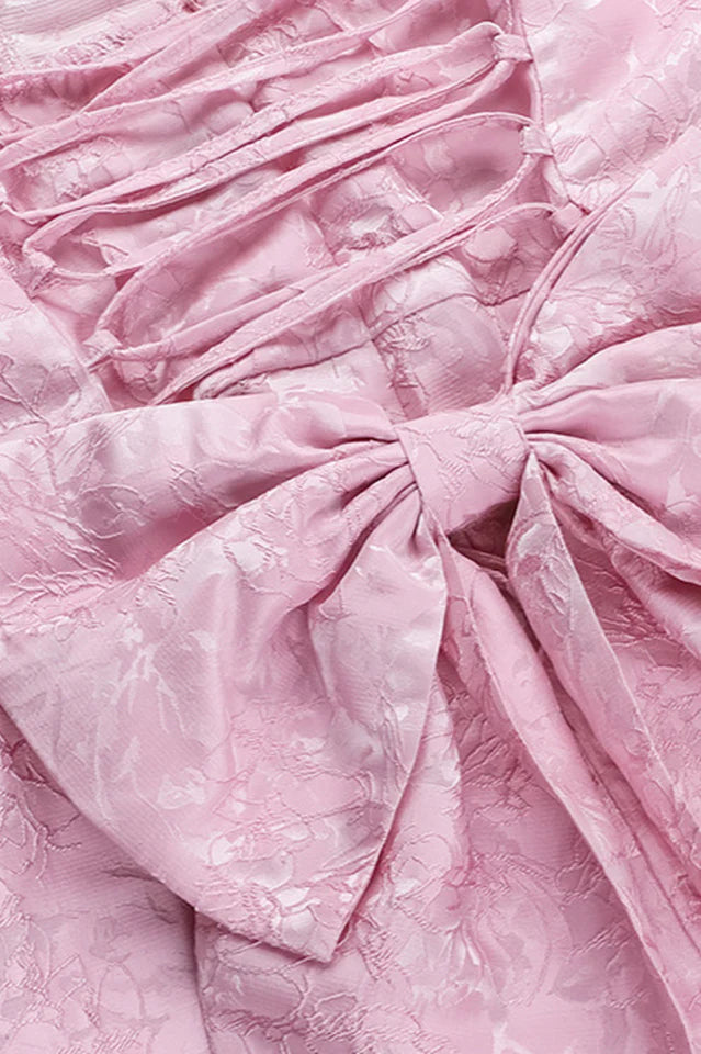 This dress is your go-to for creating a statement at any event. With its structured bodice and elegant, floral jacquard fabric, it offers a timeless silhouette that enhances your figure. The standout feature is the oversized bow at the back, which can be worn on or off, allowing you to switch up your look effortlessly. Whether you choose to keep the bow on for an extra touch of drama or remove it for a more streamlined appearance, this dress adapts to your style needs. Perfect for late summer gatherings or any special occasion where you want to leave a lasting impression.