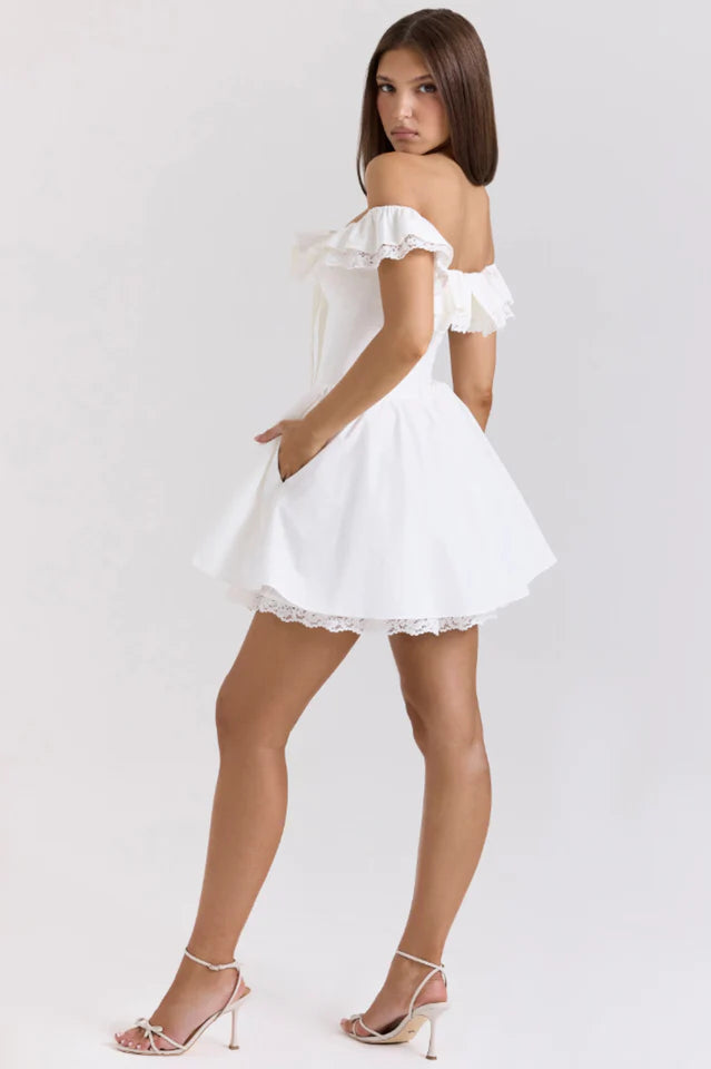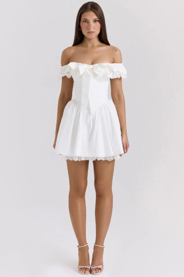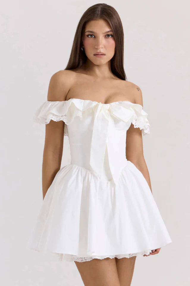 We've got cute dresses down to a tee and 'Jaide' is a case in point. It's cut from crisp stretch cotton to create a curve-enhancing silhouette and it flatters your waist with our signature boned construction. The off-the-shoulder shaping features fun frills and a statement bow in the centre, while the voluminous skirt is set in place with a tulle underskirt.