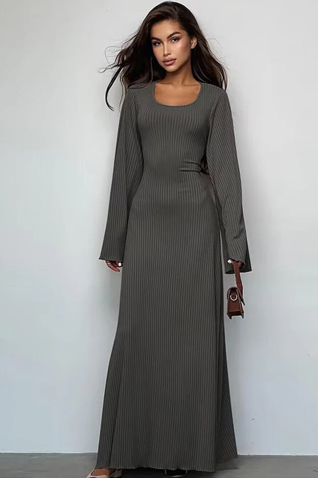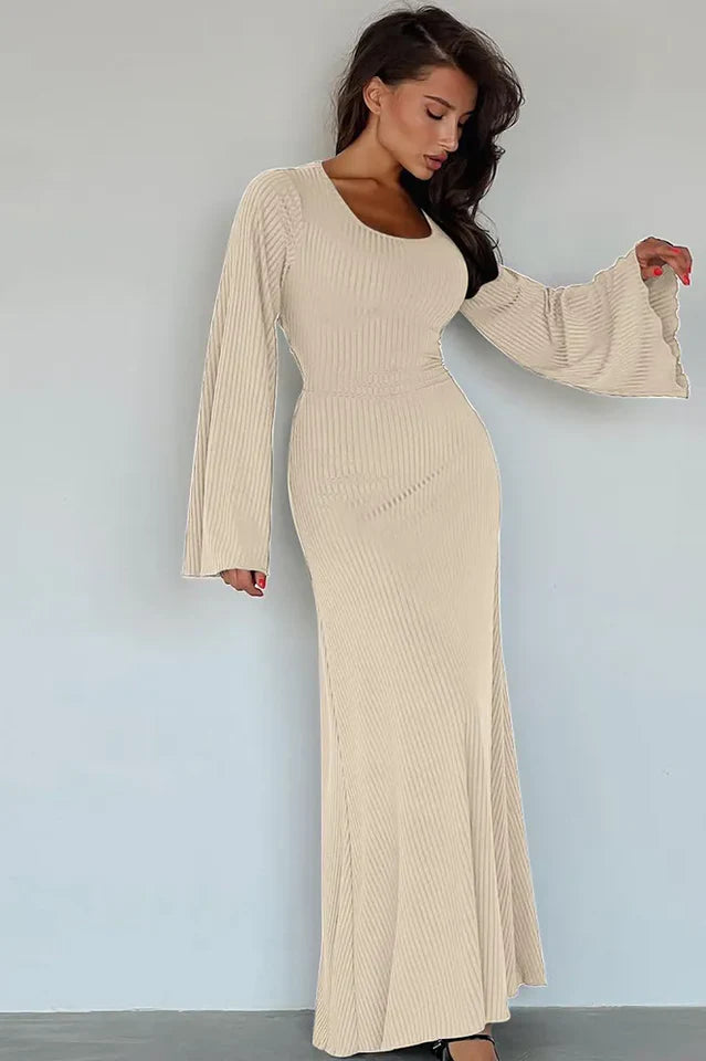 Beautiful long jersey dress with a round neckline on the front, long sleeves with bell-like ends, and lace up on the back to adjust the fit on the bust and waist.