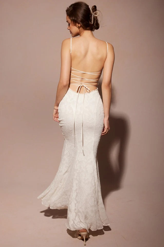 Cut from a delicate semi sheer burnout lace, 'Joan' is a romantic dream and an ode to femininity. The dainty trim to the neckline and straps turn to an open back with delicate satin ties to customise the fit. Skimming over your figure, 'Joan' falls to a floor sweeping maxi length that opens out to a glamorous godet skirt to beautifully elevate this gorgeous creation.