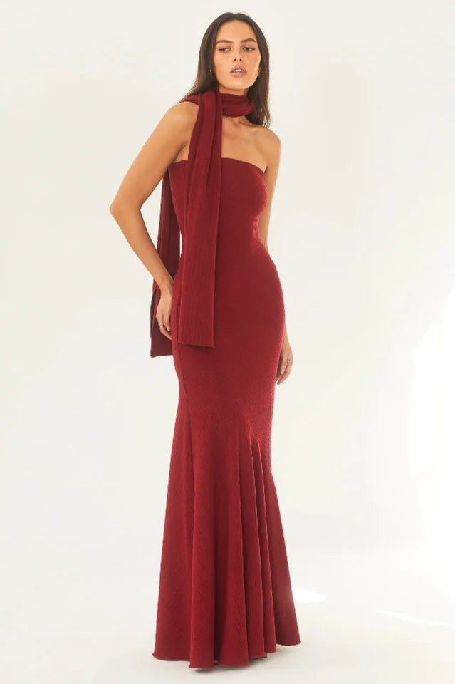 A timeless classic designed for the cooler seasons. Her strapless silhouette gracefully flows into a two-tiered bias cut gown, tailored to beautifully compliment the feminine form. Crafted from a luxurious heavy knit in a gorgeous deep rouge red hue, Juliana is the perfect combination of comfort & elegance.