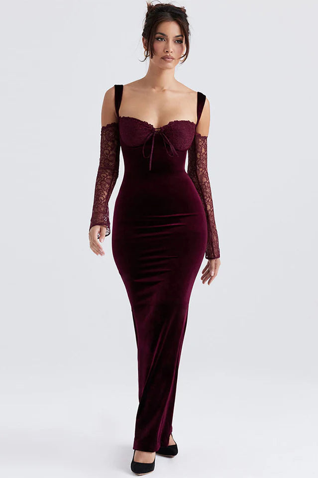 When every detail is in place, the only thing left to do is slip into the Kaia Evening Velvet Maxi Dress and dance the night away! Cut from sumptuously soft stretch velvet in burgundy color, this dress hugs the figure to enhance your curves. The pretty lace cups and the delicate lace sleeves add elegant drama. We love the floor-pooling maxi length for a show stopping silhouette that looks perfect styled with your high heels for your next special occasion. Hidden back zipper/clasp.