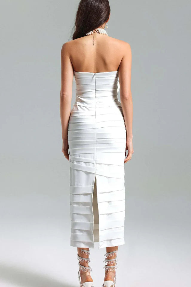 Pleated 3D Floral Bustier Dress offers a blend of classic pleats with charming 3D floral accents, creating an elegant and stylish ensemble suitable for various formal events or special occasions.