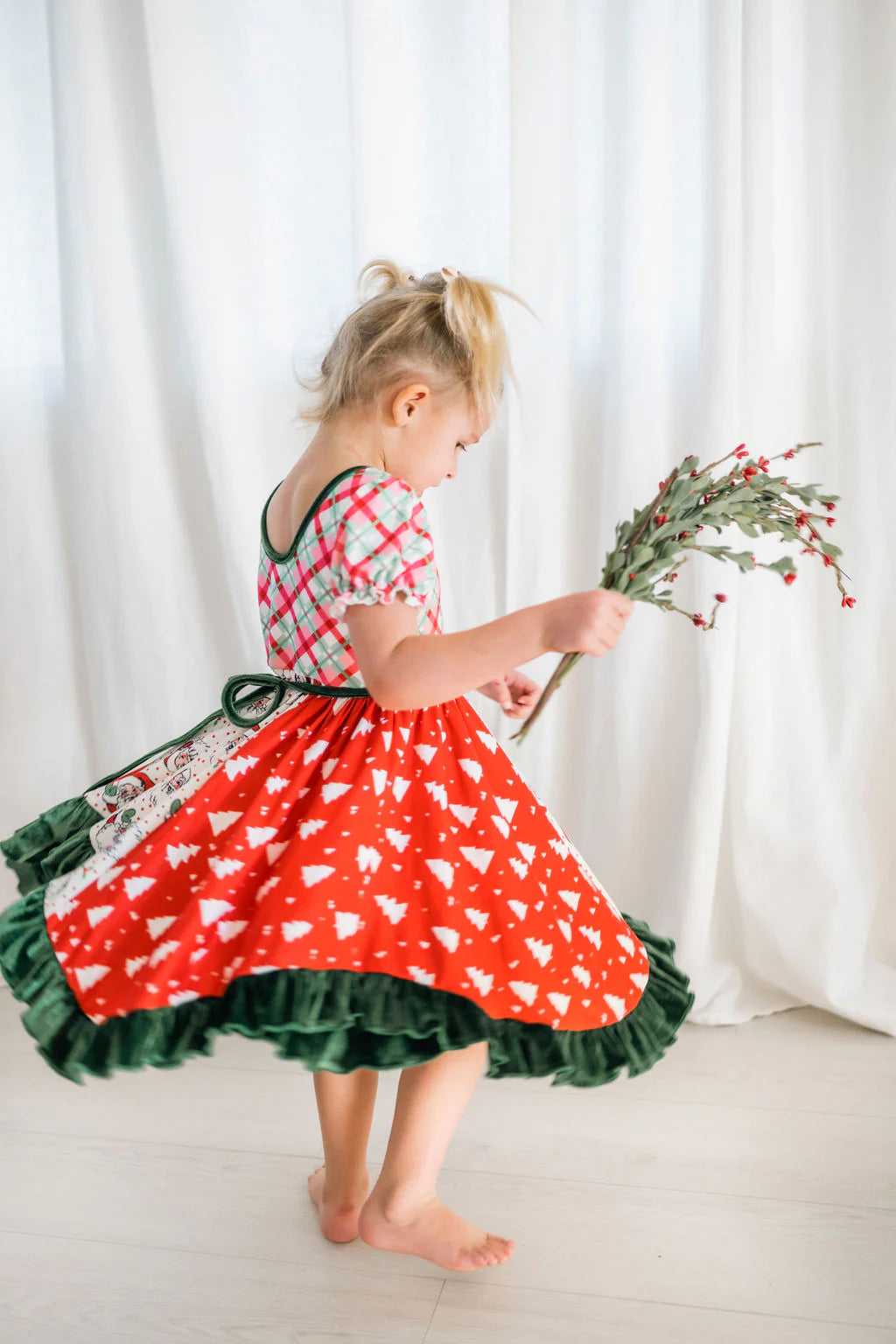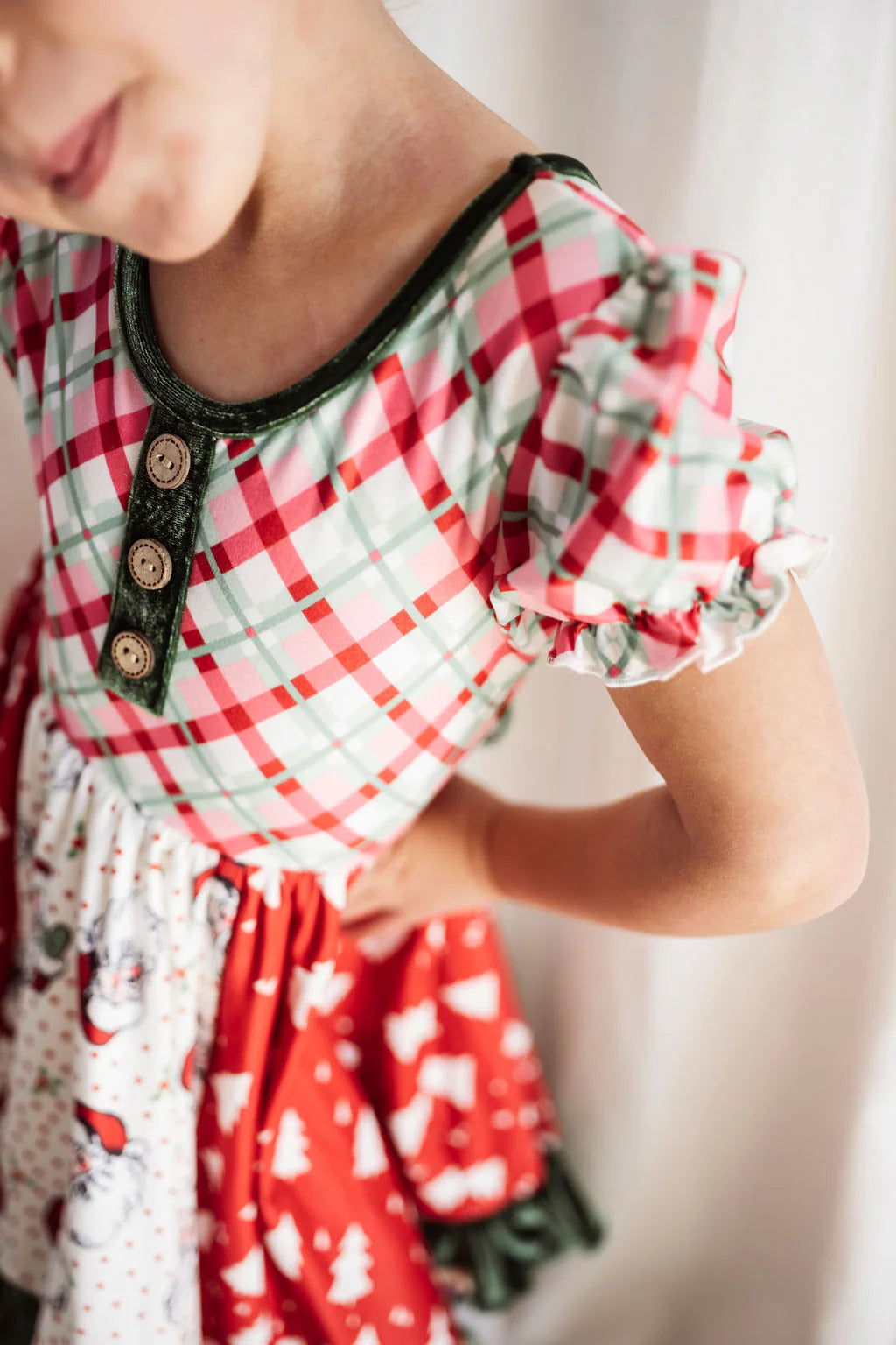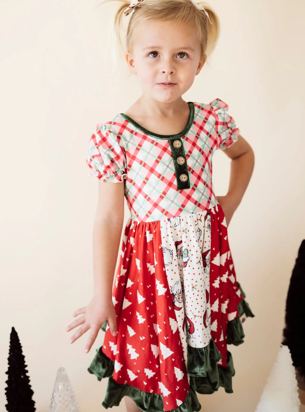 Celebrate the season in style with the Kate Knit Dress - Jolly St. Nick. This charming holiday dress features a festive mix of prints, combining Santa motifs, plaid patterns, and holiday trees, all accented with a vibrant green trim. Perfect for holiday gatherings, it brings cheer and comfort together, making your little girl’s celebration both joyful and memorable.