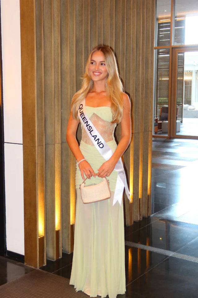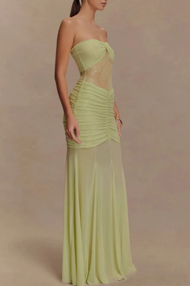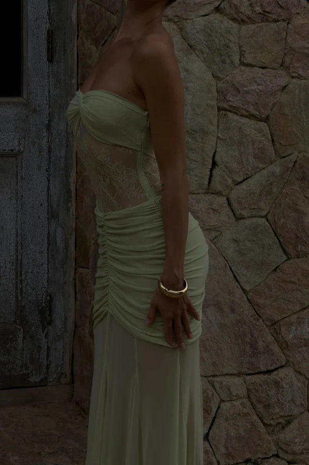 The KHADIJAH Lace and Mesh Maxi Dress is a romantic showstopper designed to captivate. Featuring a strapless neckline with a twisted, gathered bust detail, this silhouette highlights the figure with a delicate lace panel bodice and a softly gathered waist. The voluminous mesh skirt adds graceful movement, creating a beautiful contrast to the fitted upper half. Partially lined for coverage with a hint of sheerness, this dress is the perfect choice for special occasions, formal evenings, or moments that call for effortless enchantment.