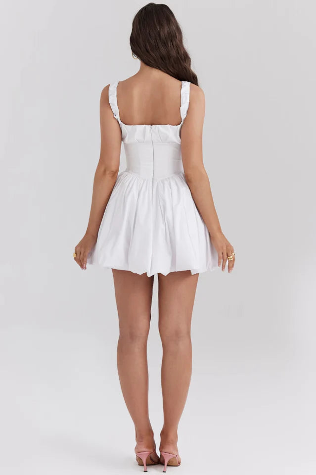 In the most feminine puff silhouette with gathered detailing, this dress is possibly our prettiest white mini of the season. Cut from a stretch cotton rich fabric, the bodice features our waist cinching corsetry and the wide straps frame the flattering square neckline. We love how romantic 'Le Puff' is and we adore its sweetly puffed mini skirt that's layered with tulle for a classically feminine shape.