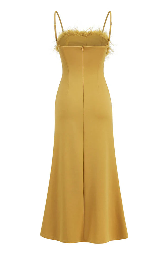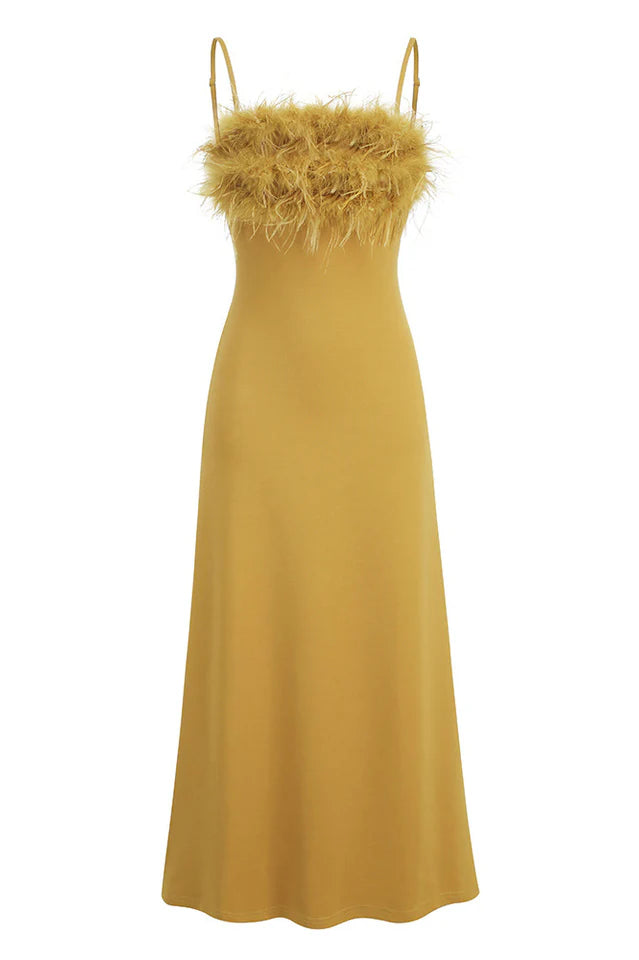 Our Leighton Yellow Feather Maxi Dress will surely wow the crowd at your next special event! Comfortable fabric outlines the seamed neckline. The bodice was styled with a strappy feather bodice, and a maxi dress hugged the curve below the fitted waist. The perfect display of your strength and seduction! Whether you are attending a banquet or a party, it will be your best choice!