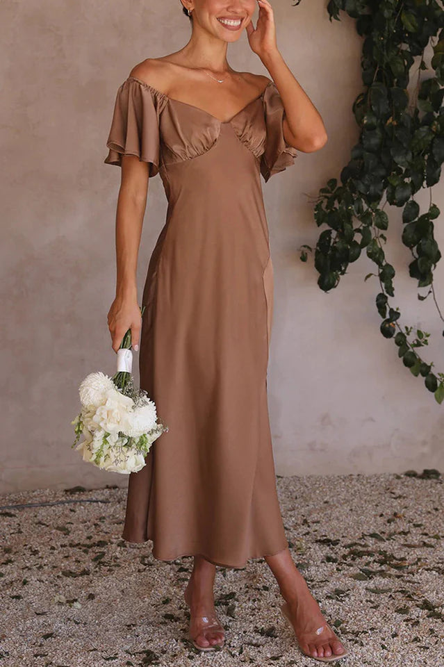 Our Louisa Dress features beautiful butterfly sleeves, flattering off shoulder design, pleated bust and a flirty front slit. This beautiful floaty design takes elegance to the next level - you'll be sure to turn heads in this number.
