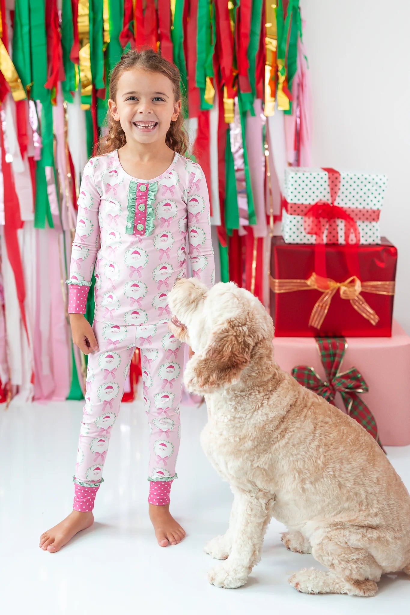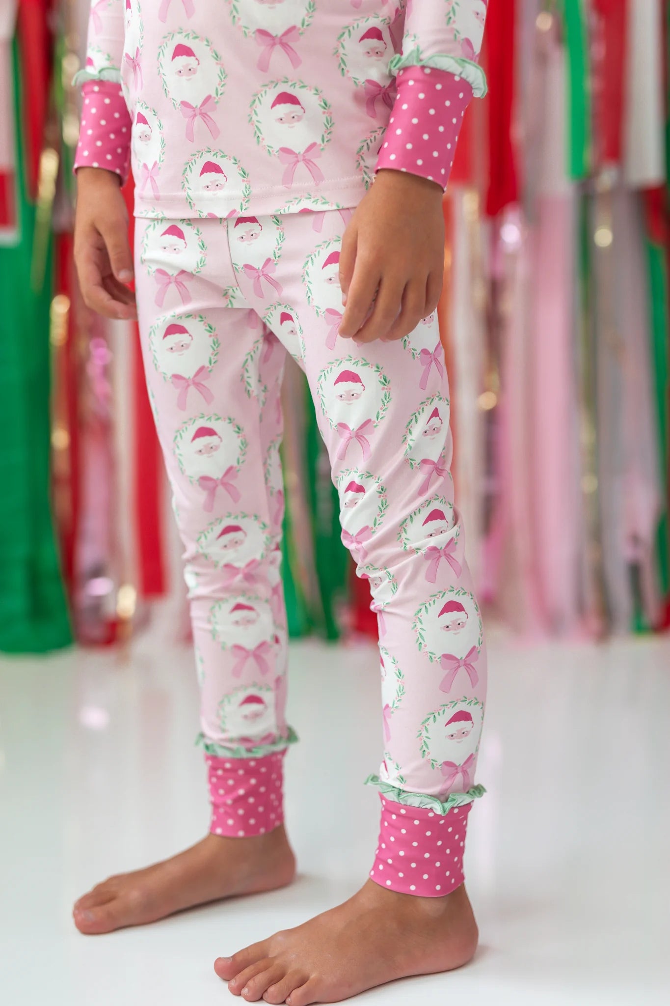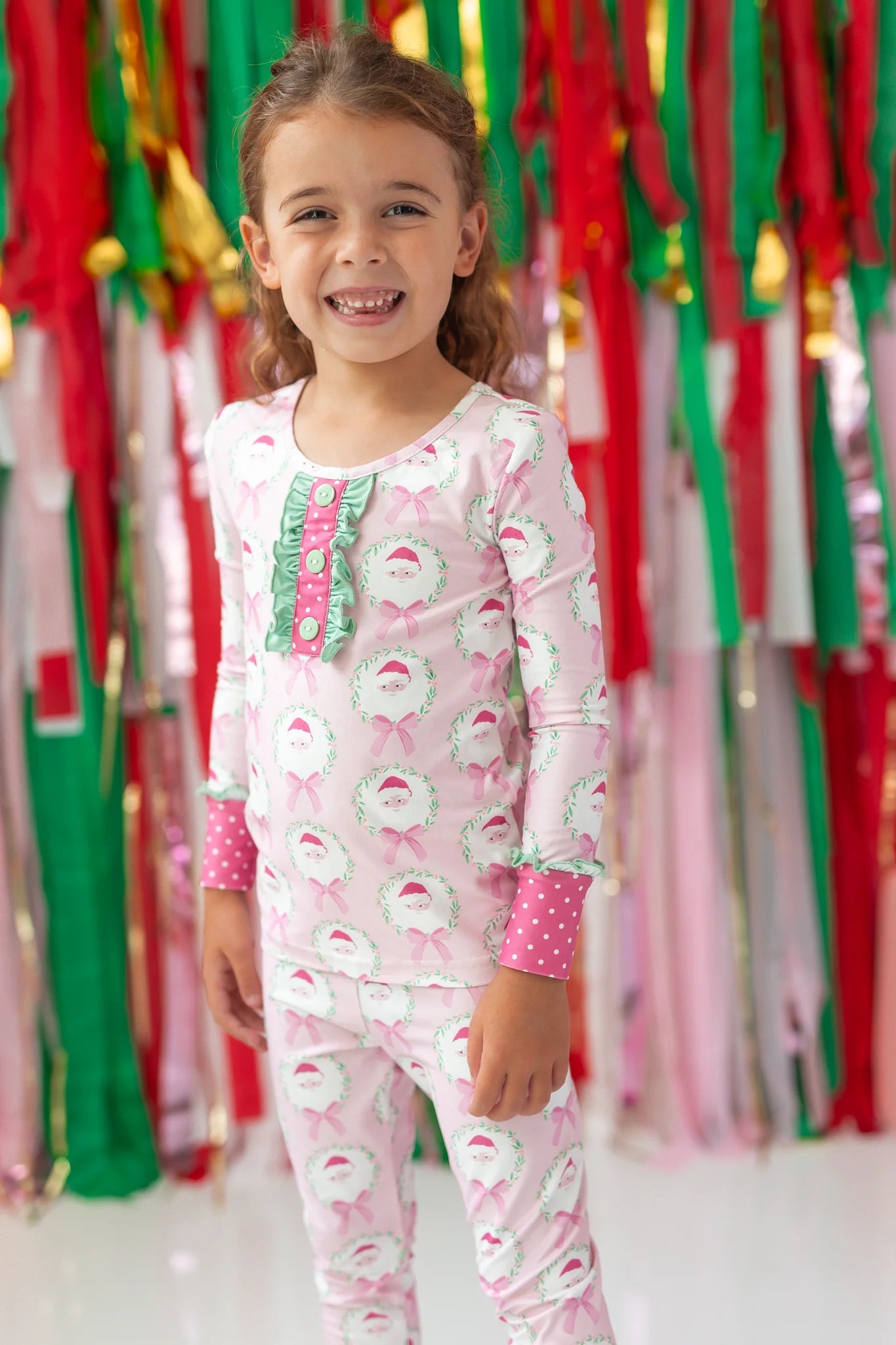 This playful girls' loungewear set in the sweetest pink features an all-over Santa pattern trimmed with fun, whimsical prints perfect for the holiday season. Soft and cozy, it keeps your little one comfy while adding a festive touch to their downtime wardrobe. Ideal for girls who adore pink and holiday cheer!