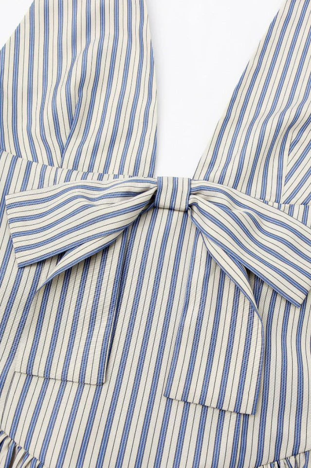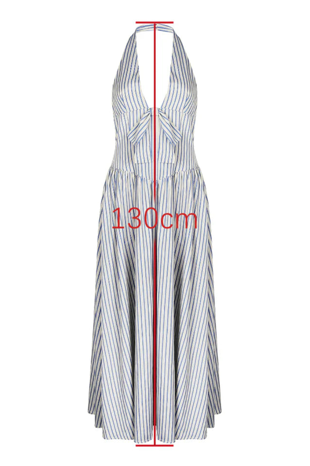 Breeze through your holiday in effortless elegance with the Mackenna Dress. Designed in a classic navy beach-style stripe, this maxi dress channels relaxed vacation vibes with a polished twist. The halter neckline adds a touch of sophistication, while the smocked back and invisible zipper ensure a comfortable and flattering fit. A drop waist flows into a graceful silhouette, complete with invisible pockets for added functionality. Whether you're strolling along the coast or dining under the stars, the Mackenna Dress is your go-to piece for vacation-ready style.