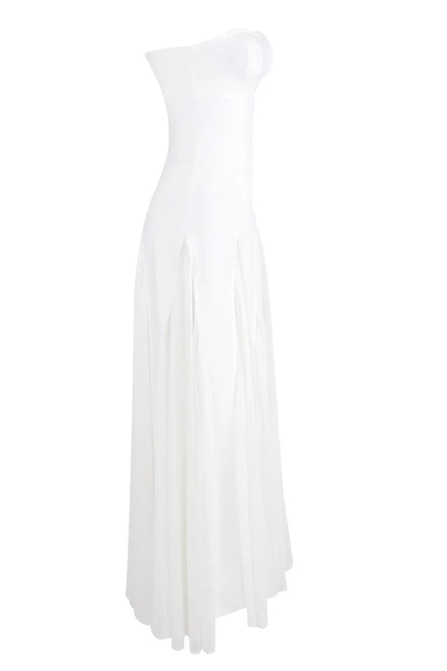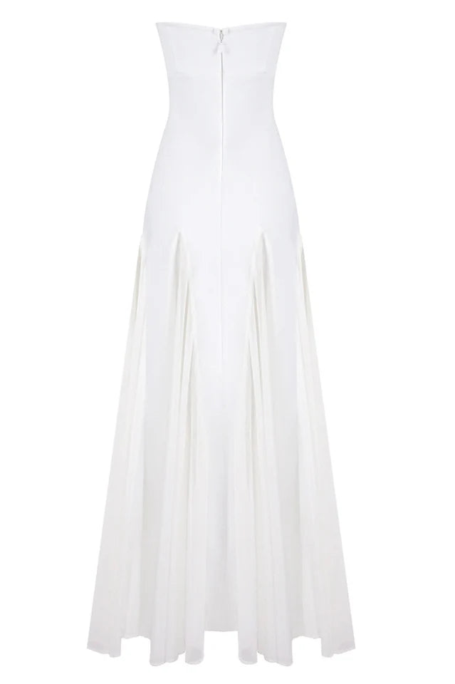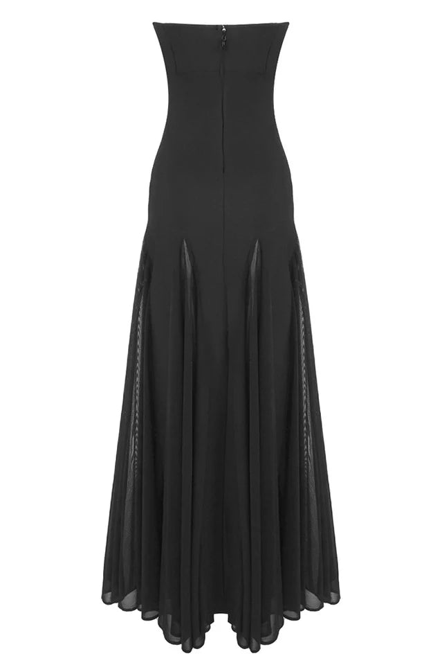 Introducing the Mae Maxi Dress. A timeless and chic maxi length design featuring our crepe knit fabrication and chiffon. This stunning dress features a strapless neckline and contrasting mesh panels creating movement throughout the dress. Finished with a centre back zip for closure.