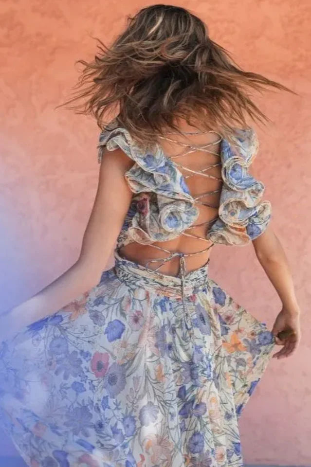Designed in airy chiffon with ruffle accents and a lace-up back, the Marissa maxi exudes romantic elegance. Perfect as a garden wedding guest dress, it flatters with a deep V-neckline and soft draping. This chiffon maxi dress balances comfort and sophistication, making it a timeless choice for weddings, vacations, and evening celebrations.