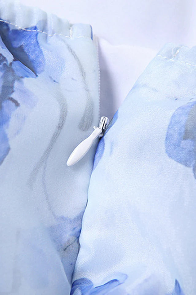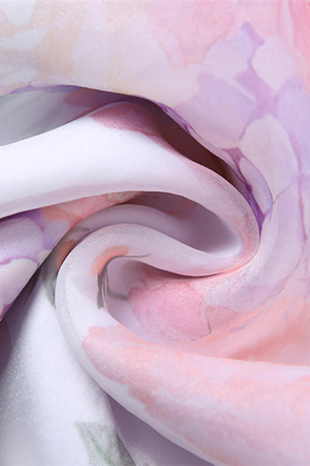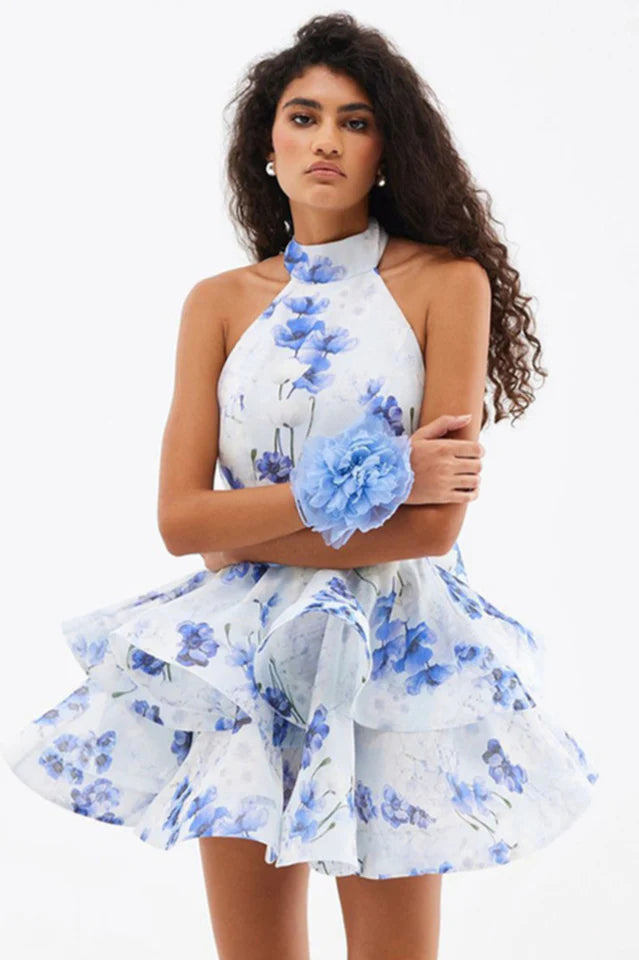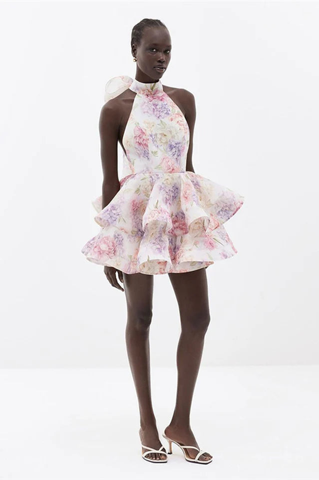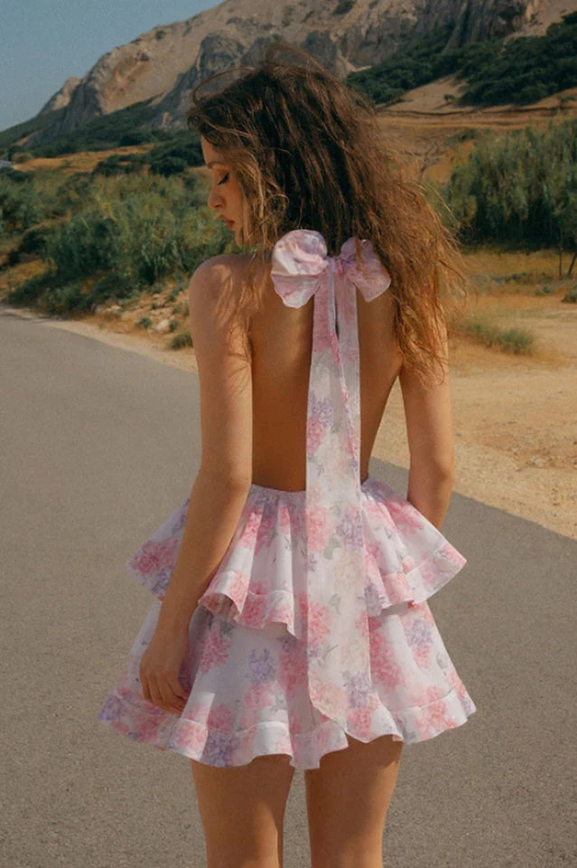 The Marissa Oversized Bow Tiered Mini Dress showcases a charming floral print, stand collar, and elegant oversized bow. Its backless, sleeveless design and tiered mini-length skirt in pink create a feminine, standout look perfect for special occasions.