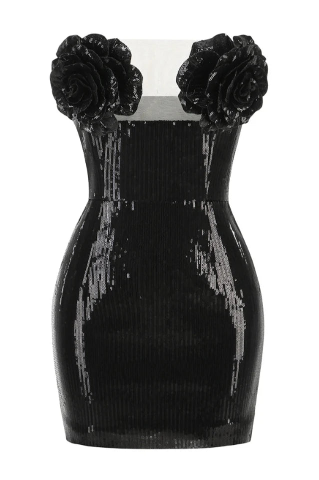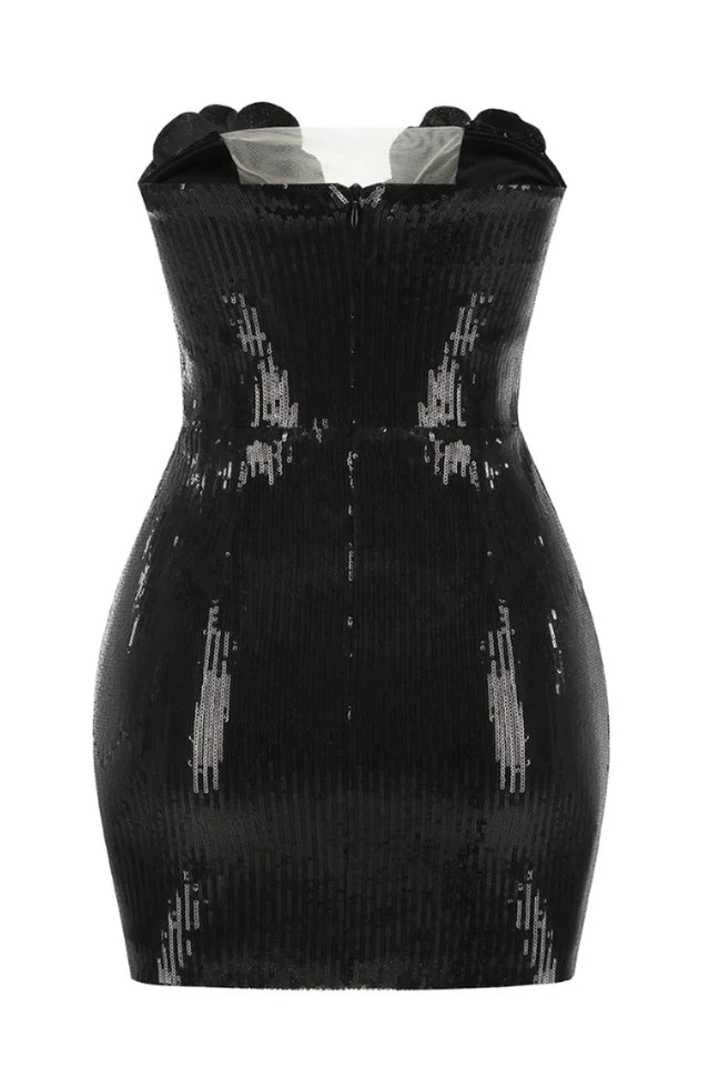 This Masozi strapless dress is adorned with beautiful flower sequins, adding a touch of glamour to any occasion. Its strapless design allows for a flattering and comfortable fit, while the mini length shows off your legs and adds a playful element to your outfit. Perfect for a night out or special event!