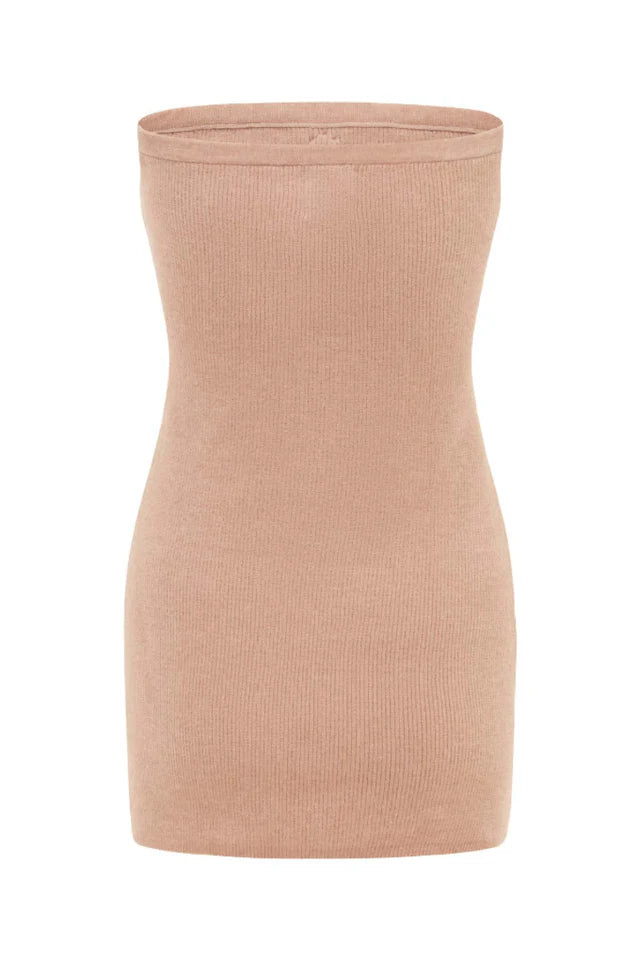 The Mercer Dress is a straight neck boobtube style dress with an asymmetric split detail at the side featuring a self fabricated flower at the neck and leg.