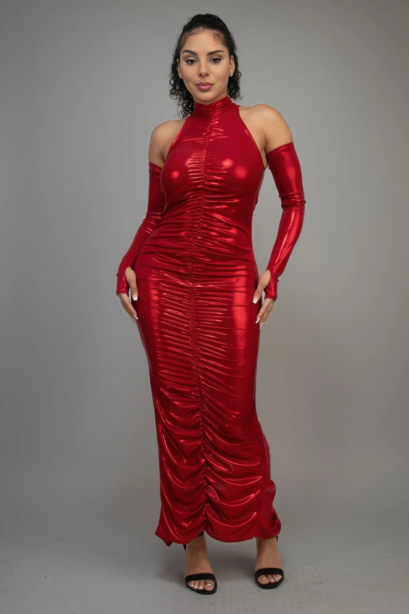 Add the Metallic Ruched Dress with Sleeves in Red to your wardrobe today and step into any event with confidence and style!