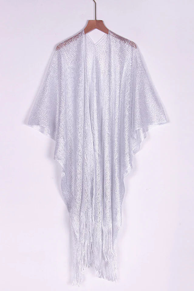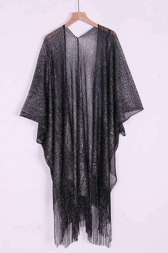 Luxe shimmering woven coverup with incredible shine! Open front cardigan for easy wear. Fringe bottom for extra style and shimmer!
