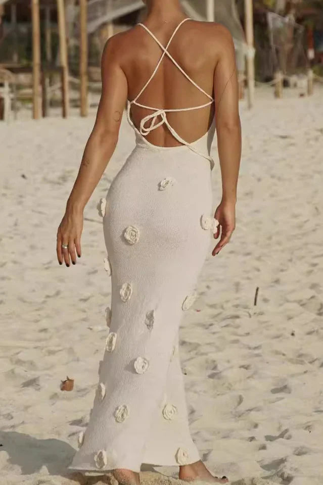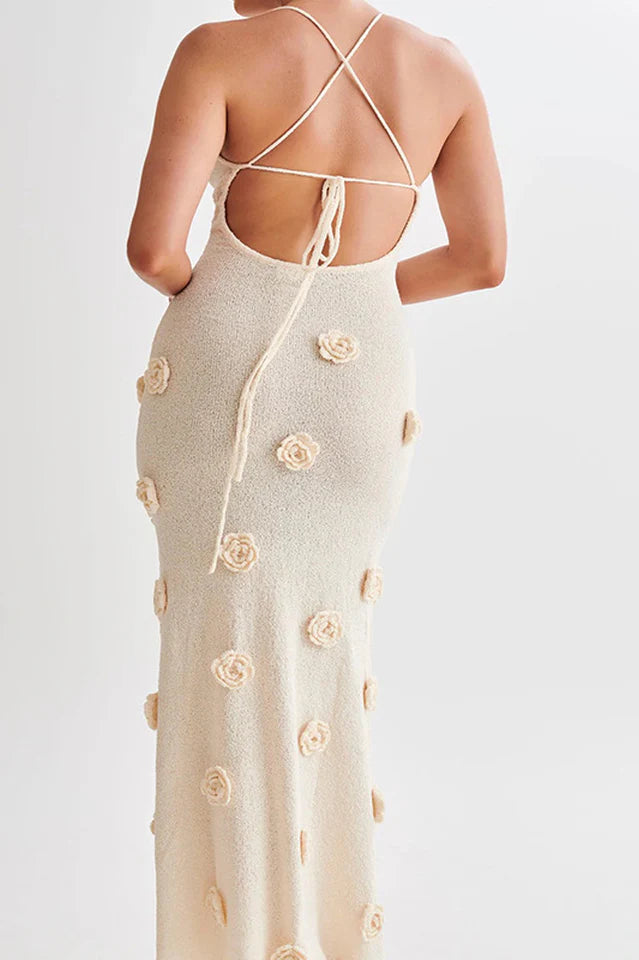 Effortlessly striking, the Mirella Knit Maxi Dress is a celebration of texture, elegance, and silhouette. Featuring a plunging V-neckline and functional crisscross straps, this unlined crochet knit design hugs the body in a flattering bodycon shape. The dimensional floral appliqués add a romantic, handcrafted touch, creating visual interest with every step.