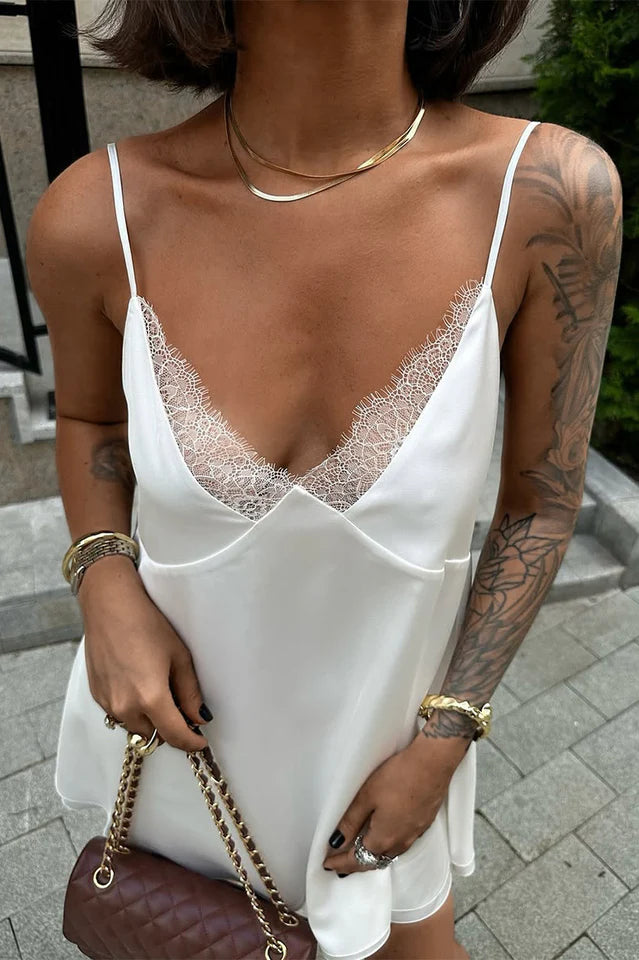 Mini Dress has a flowy A-line silhouette and romantic lace neckline. With its backless design and criss-cross tie-up strap.