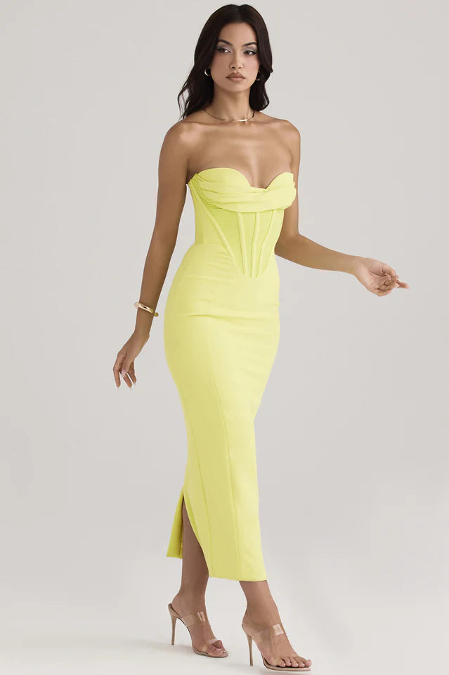 The neon hues of the dress are sure to make a statement wherever you appear. Crafted from stretch-crepe, it has a fitted fit that accentuates your curves, a strapless heart neckline that flatters your figure, and a stunning and sophisticated drape. The upper body features our incredibly tight herringbone bodice to cinch in at the waist and from our special strength mesh fabric for an enhanced fit.