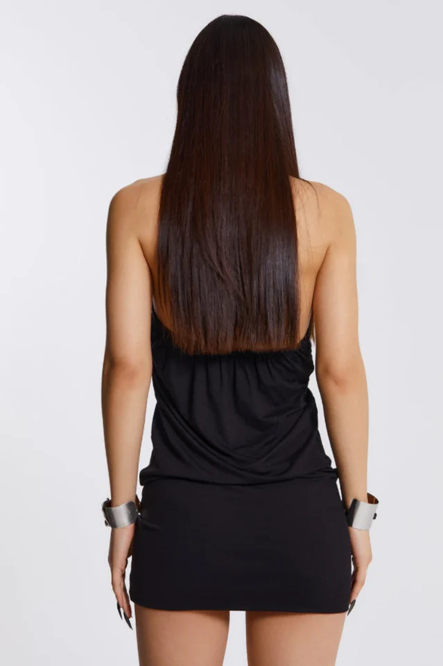 The Noir Draped Mini Dress, a part of the Vendetta collection, features a classic halterneck tie fastening and a 2000's-inspired silhouette. The black draped jersey fabric is accented with an antique silver trim detail.