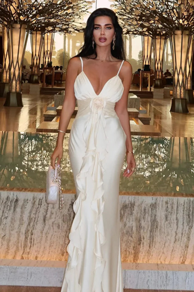 The Paige 3D Floral Halter Maxi Dress is a sophisticated and elegant gown that exudes timeless charm. Crafted from luxurious fabric, this dress features a halter neckline adorned with delicate spaghetti straps, providing both support and a touch of femininity. The bodice is intricately designed with ruching detail that adds texture and dimension, while a prominent rose-like embellishment at the waist serves as a focal point, enhancing the overall aesthetic.